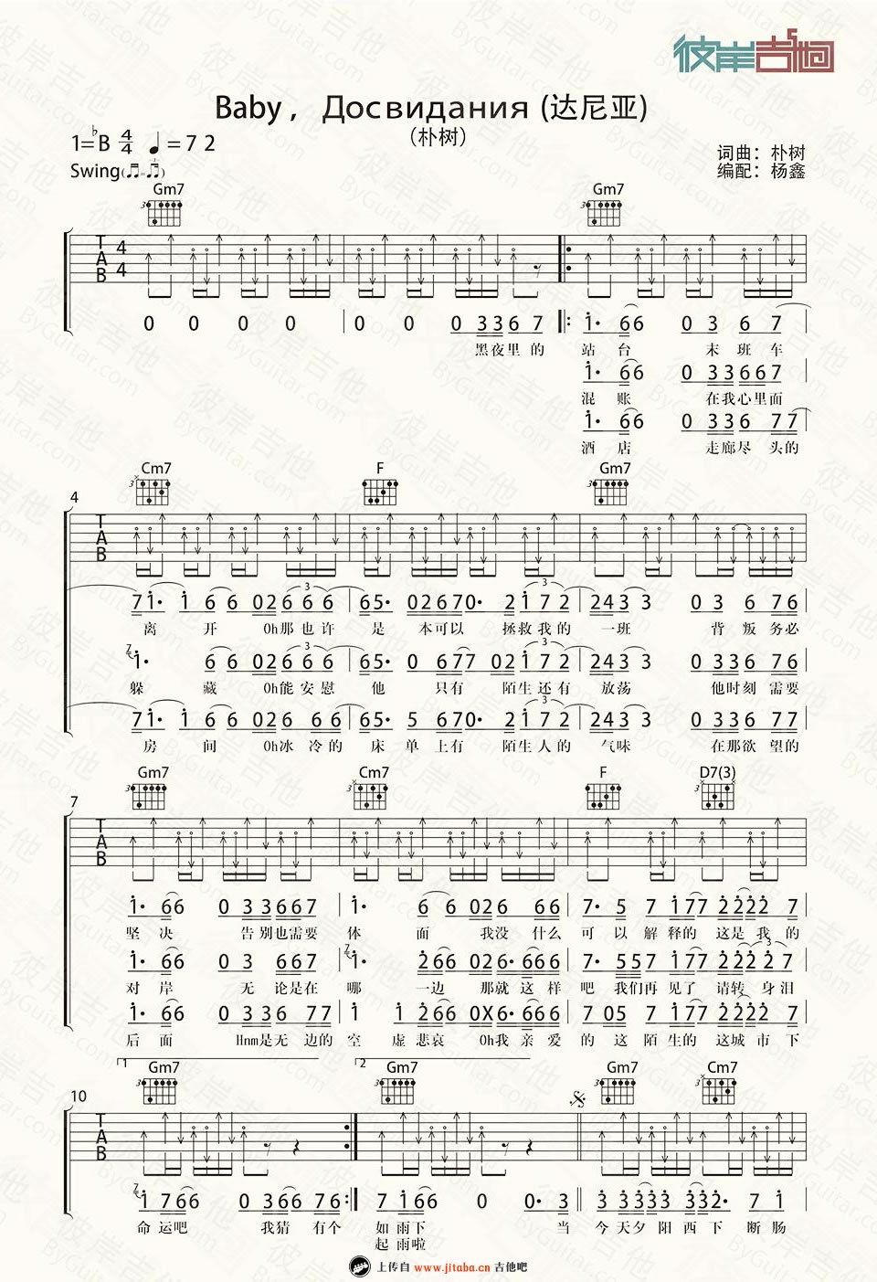 曲谱介绍: 朴树新歌,达尼亚吉他谱,达尼亚六线谱,吉他弹唱图片谱。Baby,До свидания,宝贝再见的意思。一首充满俄罗斯异域情调风情的歌曲,由朴树词曲创作,MV邀请了刘烨出演男主。背叛务必坚决,告别亦须体面,歌词直面人心,孤独又颓靡的意境里,有着最为真实透彻的情感。感谢彼岸吉他首发,朴树《达尼亚》吉他谱,91吉他谱网站推荐分享。