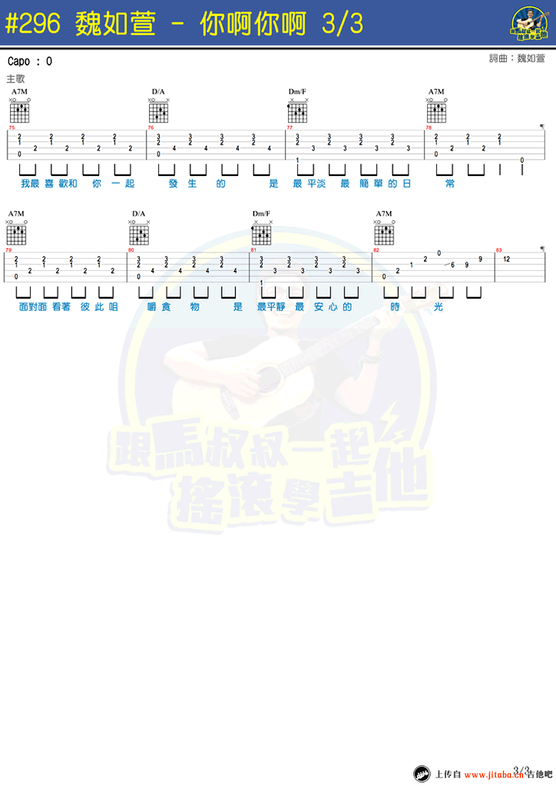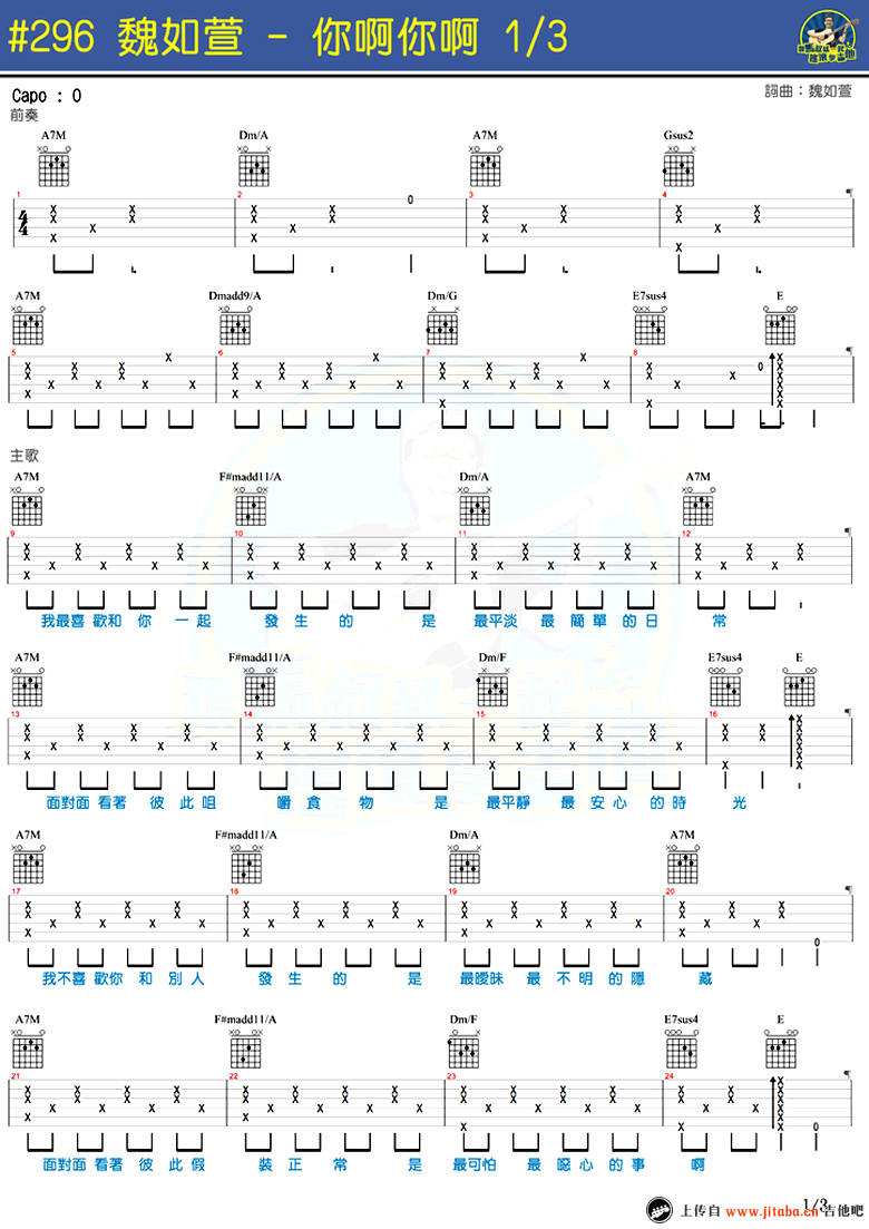 曲谱介绍: 魏如萱《你啊你啊》吉他谱,带前奏六线谱完整版,你啊你啊吉他弹唱谱,马叔叔吉他教学。我最喜欢和你一起发生的,是最平淡最简单的日常,面对面看着彼此咀嚼食物,是最平静最安心的时光。魏如萱最新专辑《末路狂花》主打歌曲《你啊你啊》融入了国语歌词、闽南语副歌,不明所以的哼唱听来十分感人。