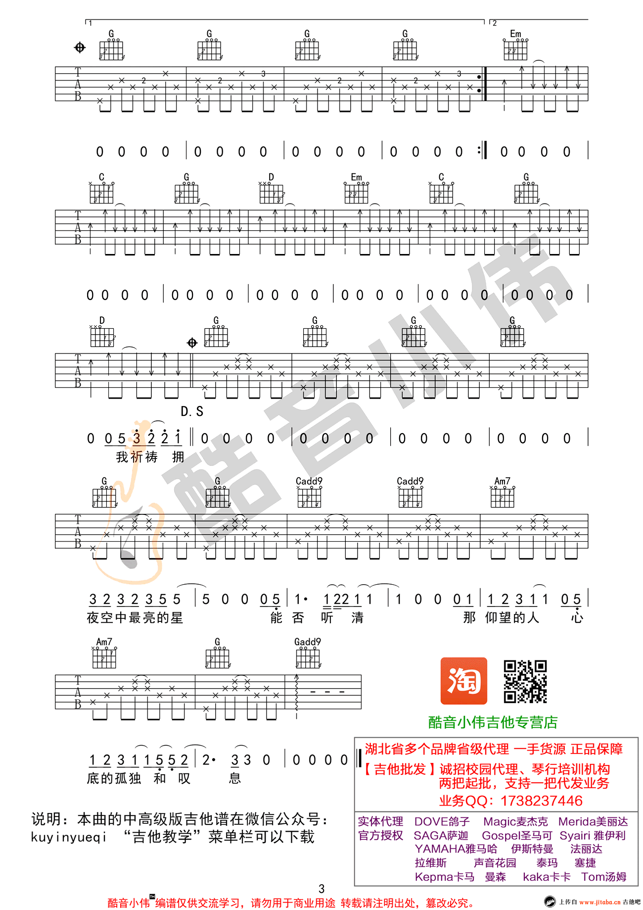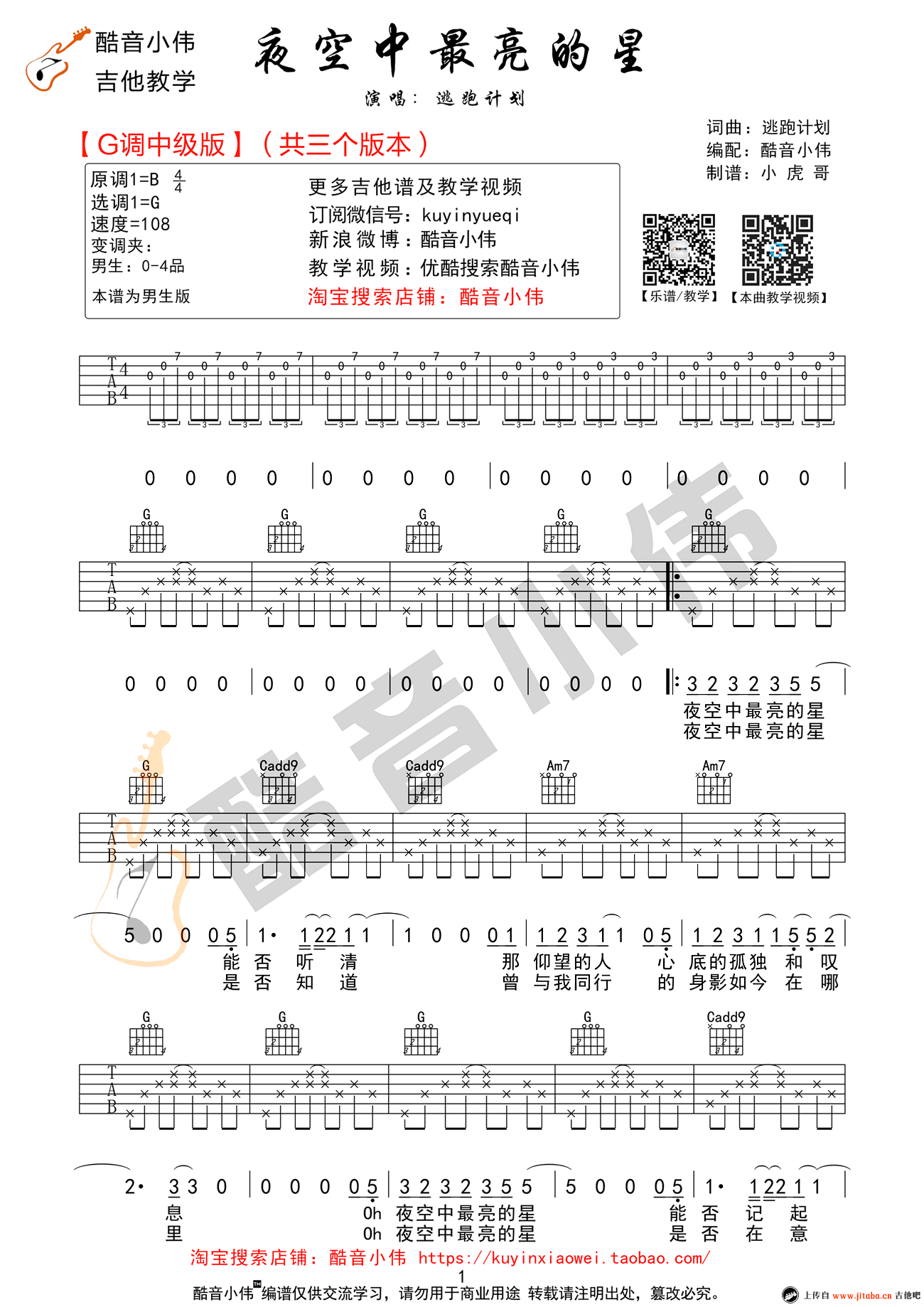 曲谱介绍: 夜空中最亮的星吉他谱,G调指法编配,男生版中级版吉他教学。逃跑计划乐队的一首经典代表歌曲,夜空中最亮的星六线谱,三张图片谱完整谱例。小伟老师也为琴友们准备了A调指法的中高级版本,大家感兴趣可以移步练习。夜空中最亮的星吉他谱_A调原版_弹唱教学视频