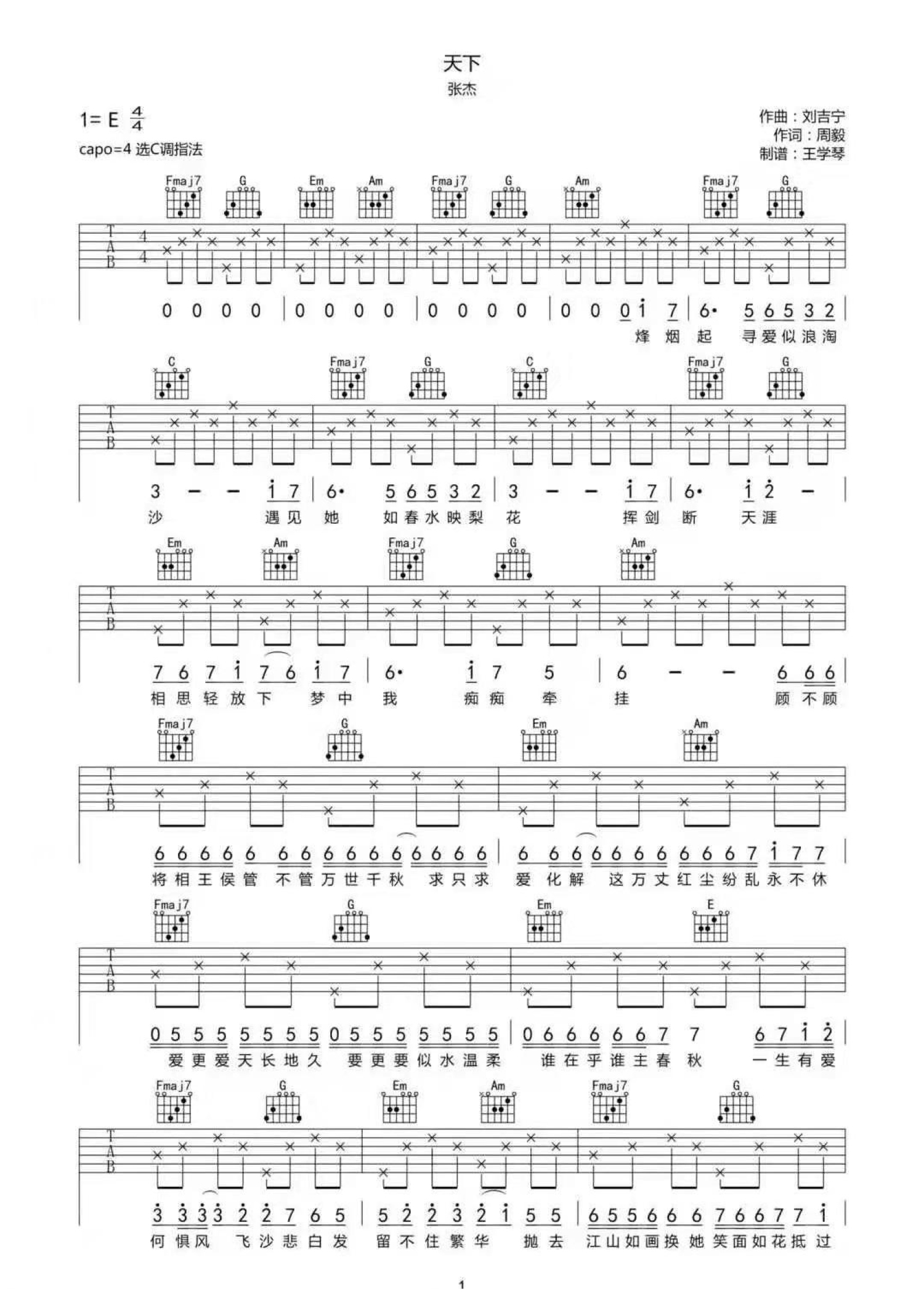 曲谱介绍: 张杰《天下》吉他谱_C调吉他弹唱谱