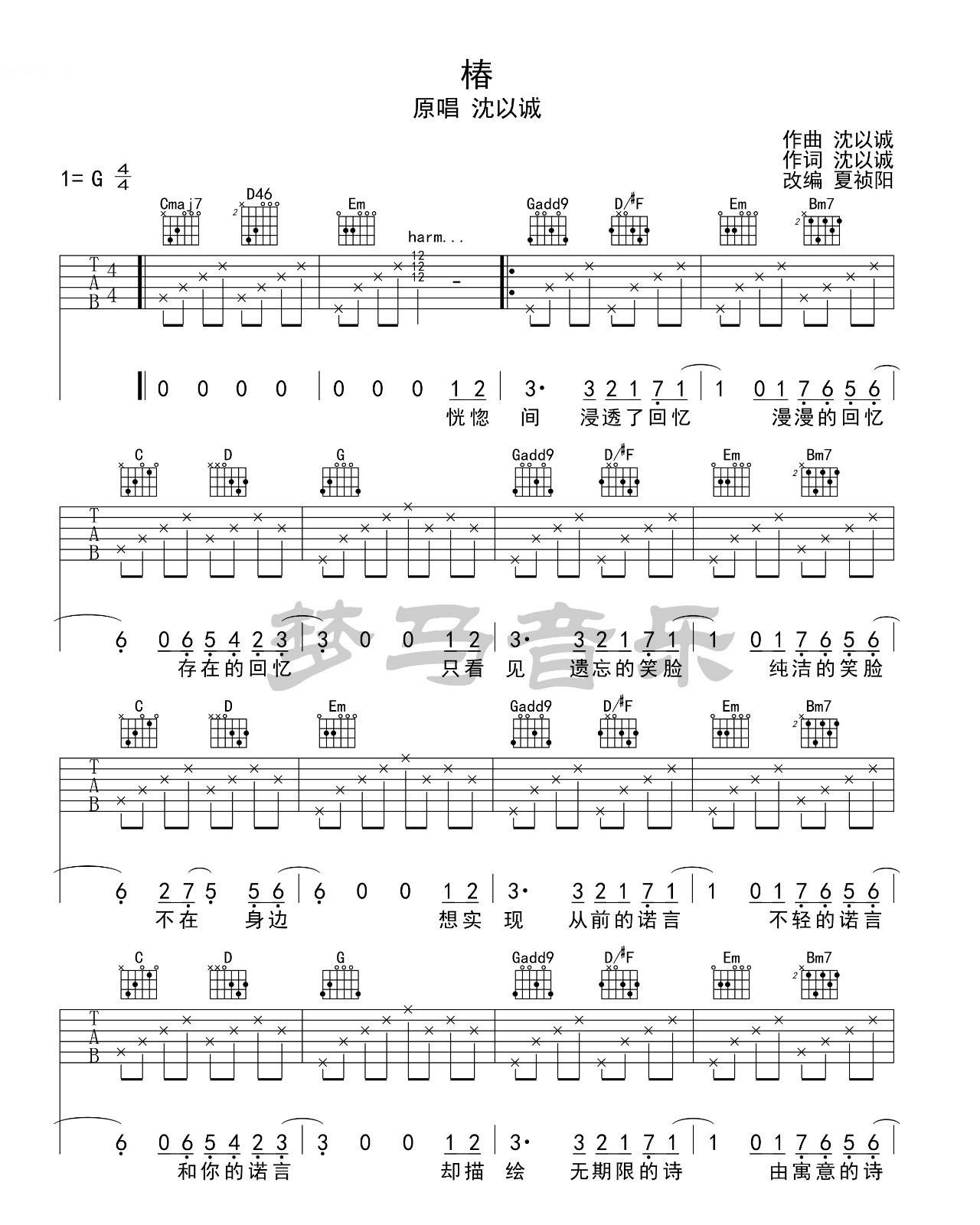 椿 沈以诚 G调图片标准版吉他谱 - 椿 - G调吉他弹唱谱