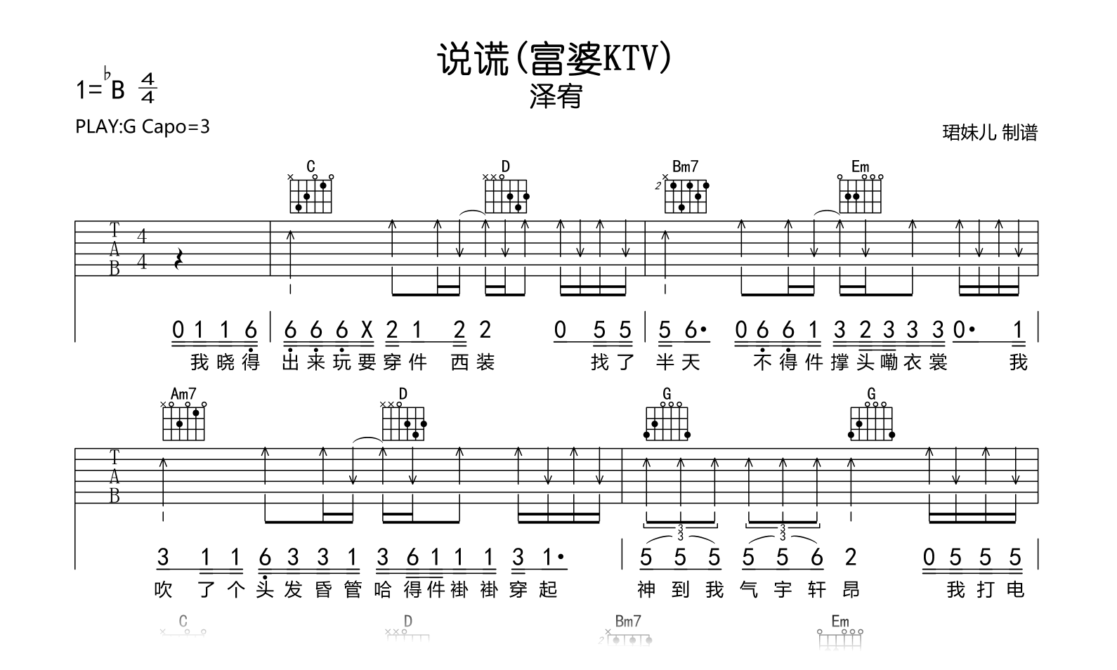 曲谱介绍: 说谎(富婆KTV)吉他谱,泽宥演唱,别名说谎贵州版、嬢嬢开门,《说谎(富婆KTV)》吉他弹唱谱,原调降B,采用G调指法编配,弹唱建议变调夹capo3品,速度85BPM难度较简单,易上手。