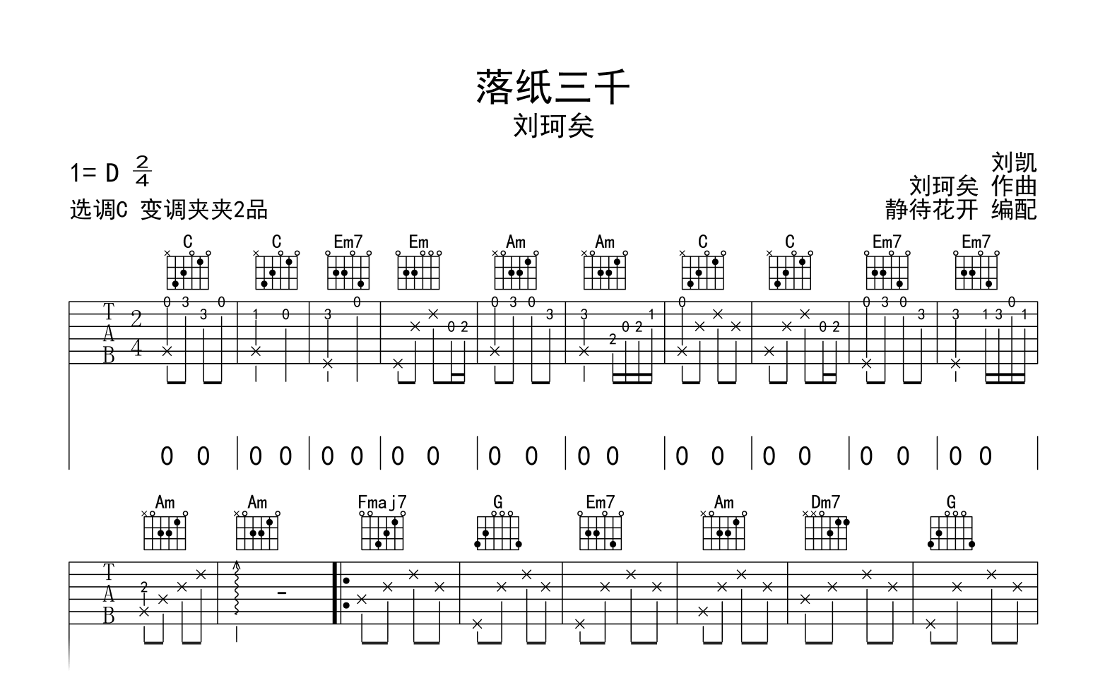 曲谱介绍: 落纸三千吉他谱,刘珂矣演唱,一首围炉暖曲岁暮温蕴。《落纸三千》吉他弹唱谱,编配制谱采用C调和弦编配,建议变调夹夹第2品,原调D调,琴友们也可根据嗓音选择变调夹位置,速度大概80拍每分钟,演奏难度简单。