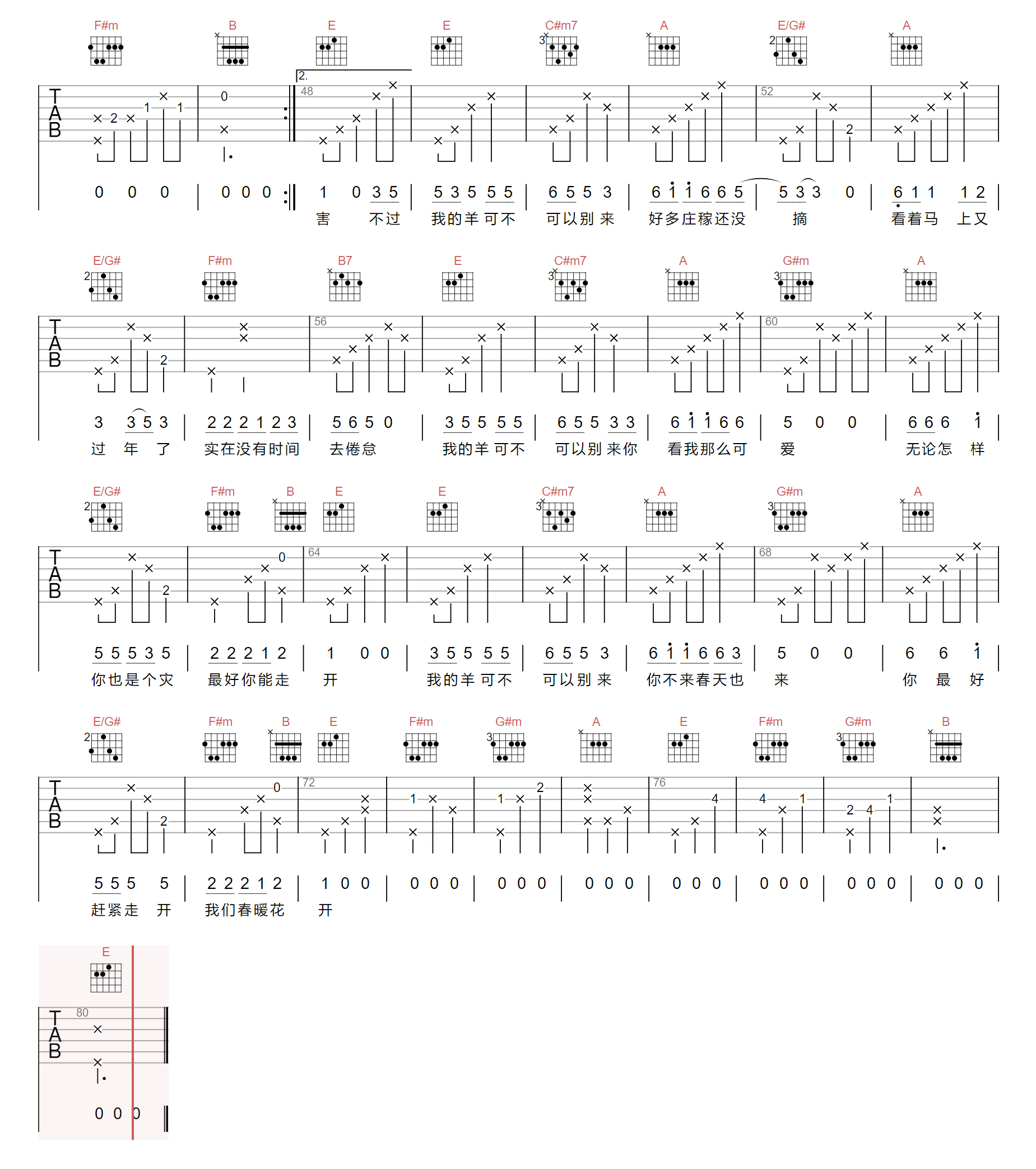 曲谱介绍: 吉他谱介绍:赶羊调吉他谱,小柯演唱的一首歌曲,3/4拍的节奏,这首歌曲的原调为E调,这里曲谱采用了E调指法进行编配,演唱时可不夹变调夹,曲谱由琴谱网更新上传,共2张高清图片弹唱吉他谱例,来源于@亦落编配出品。这也近来民间常以阳了代指得新冠,小柯也是运用羊、阳的谐音,唱出祝愿人们躲过这次疫情,不要被阳了。