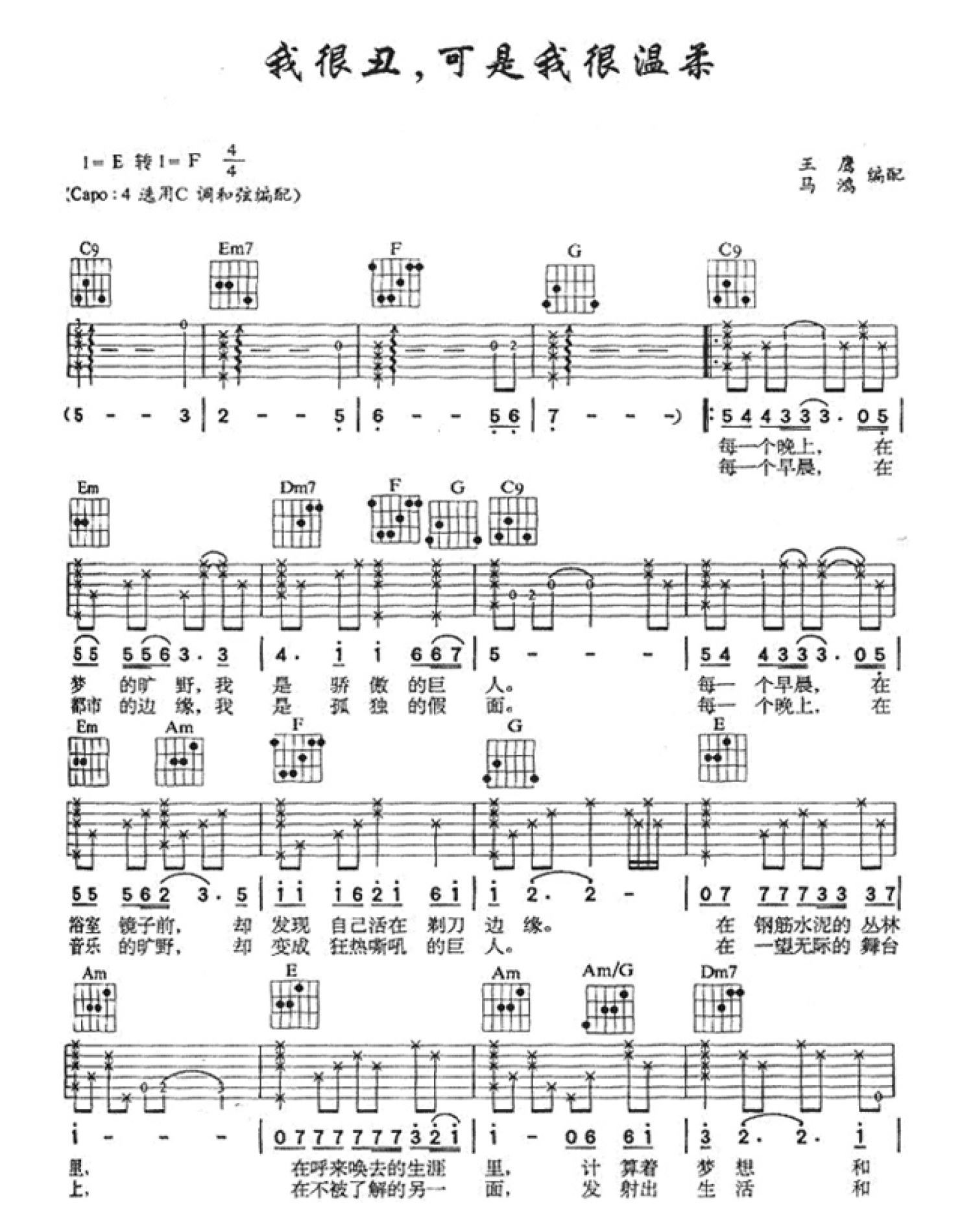 曲谱介绍: “我很丑,可是我很温柔”可以是一句调侃、可以是一个宣言,也可以是一种精神,人的内心都有坚韧的一面,你不想接受挑战、勇敢地泅渡湍急的生命之河吗?用尽气力地呐喊出对爱情的珍惜与执著,那种用整个生命去全情投入的真情,让人不能不为之动容。我很丑可是我很温柔吉他谱赵传歌曲吉他六线谱