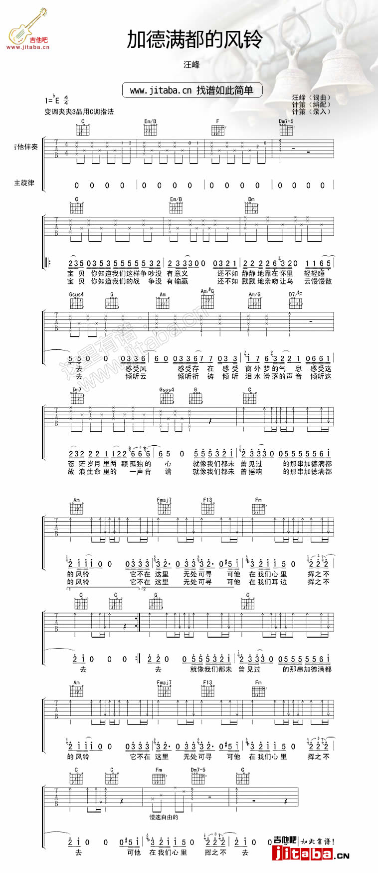 曲谱介绍: 汪峰加德满都的风铃吉他谱,CAPO夹三品,采用C调指法编配,加德满都的风铃六线谱。