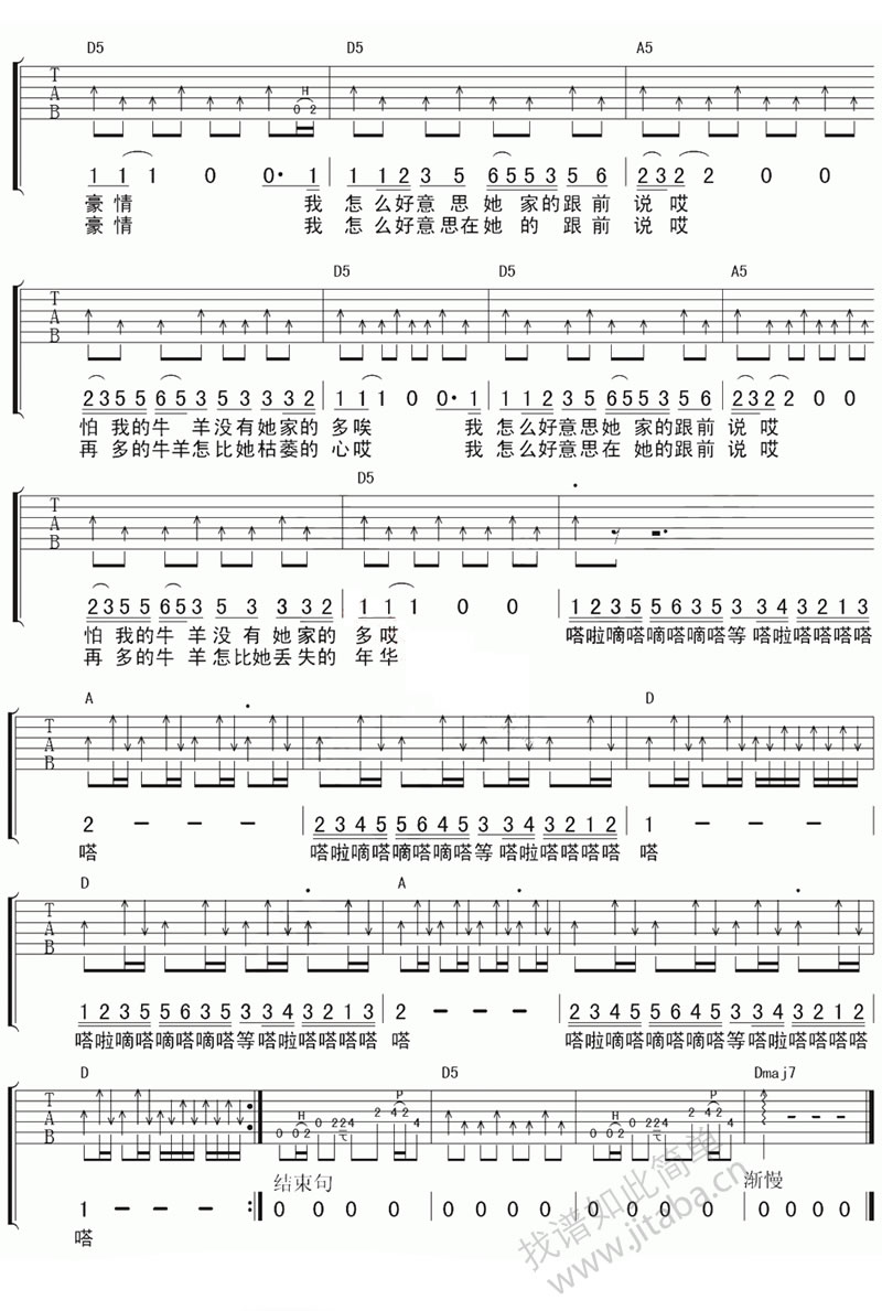 曲谱介绍: 马条塔吉汗吉他谱,六线谱编配。歌曲的《塔吉汗》来源马条多年前听来的一段故事。在新疆某个县县遇到一个弹冬不拉的放羊老人,老人说年轻的时候喜欢过一个富人家的姑娘,可自卑的他不敢向姑娘表白,到60多岁了,老人感叹说:“年轻时我们连手都没拉过,这真是挺要命的事。”,在最没有物质能力的年纪碰见了最想照顾一生的姑娘,这真让人感到无能为力;而在拥有物质的时候当初的姑娘已为人妇并苍老了容颜,这真让人感到心痛。