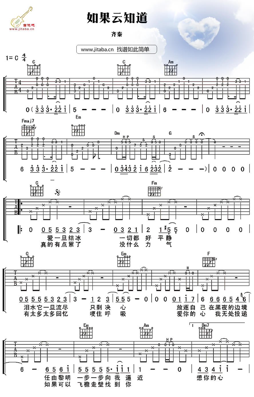 曲谱介绍: 如果云知道吉他六线谱,齐秦演唱版本编配,C调指法,如果云知道吉他谱,弹唱图片谱两张。