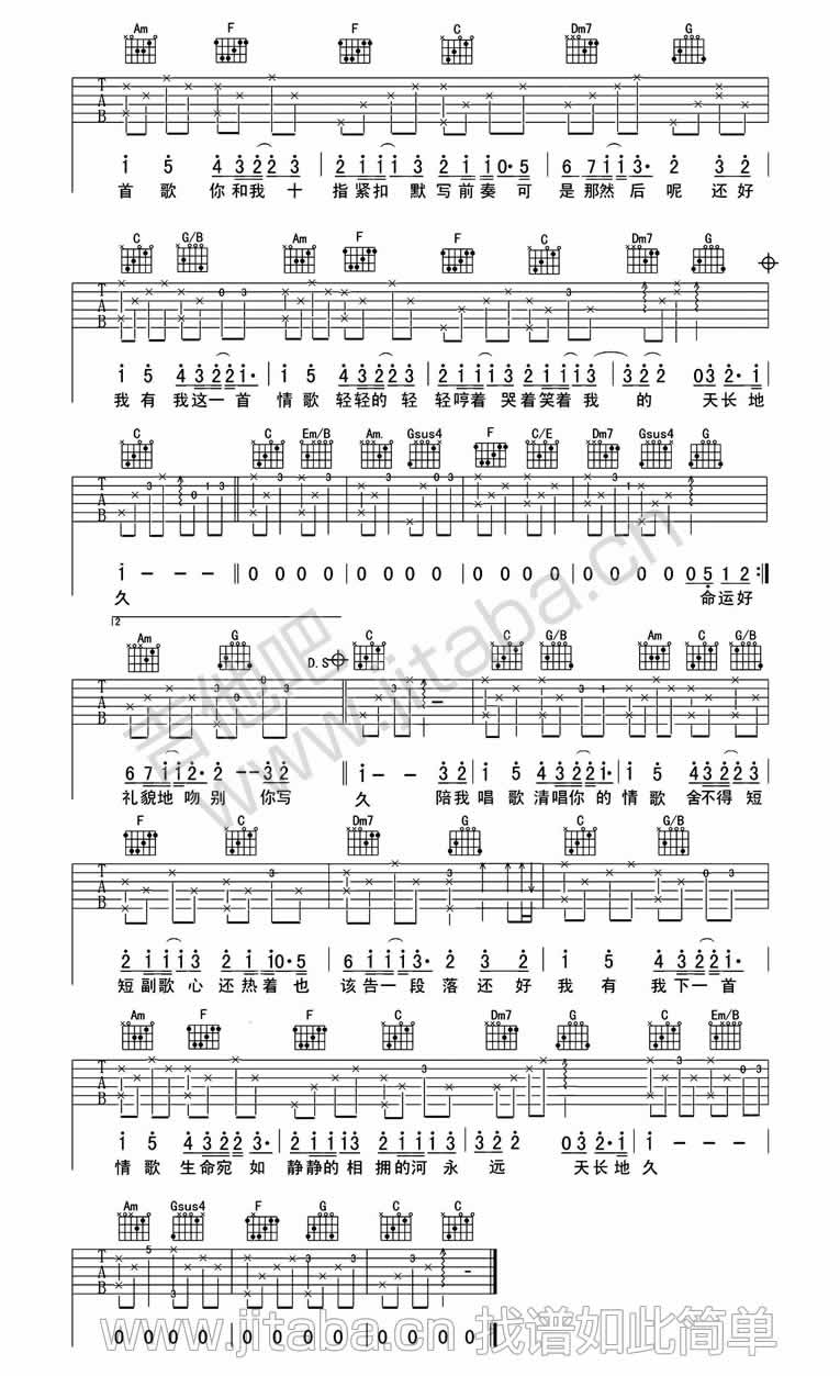 曲谱介绍: 在我们的身边,每天都那么多的情歌在传唱,但我相信,总有那么一首,单单是为你而量身定做的,唯有它能直达你的内心深处,让你不免想起当时如今.然后红了眼眶..梁静茹情歌吉他谱,情歌吉他图片谱编配。歌曲选调C调,变调夹6品,为适合吉他新手间奏没有完全遵循原版编配,使得更容易弹唱,也非常的好听。喜欢这首弹唱歌的琴友们可以收藏。