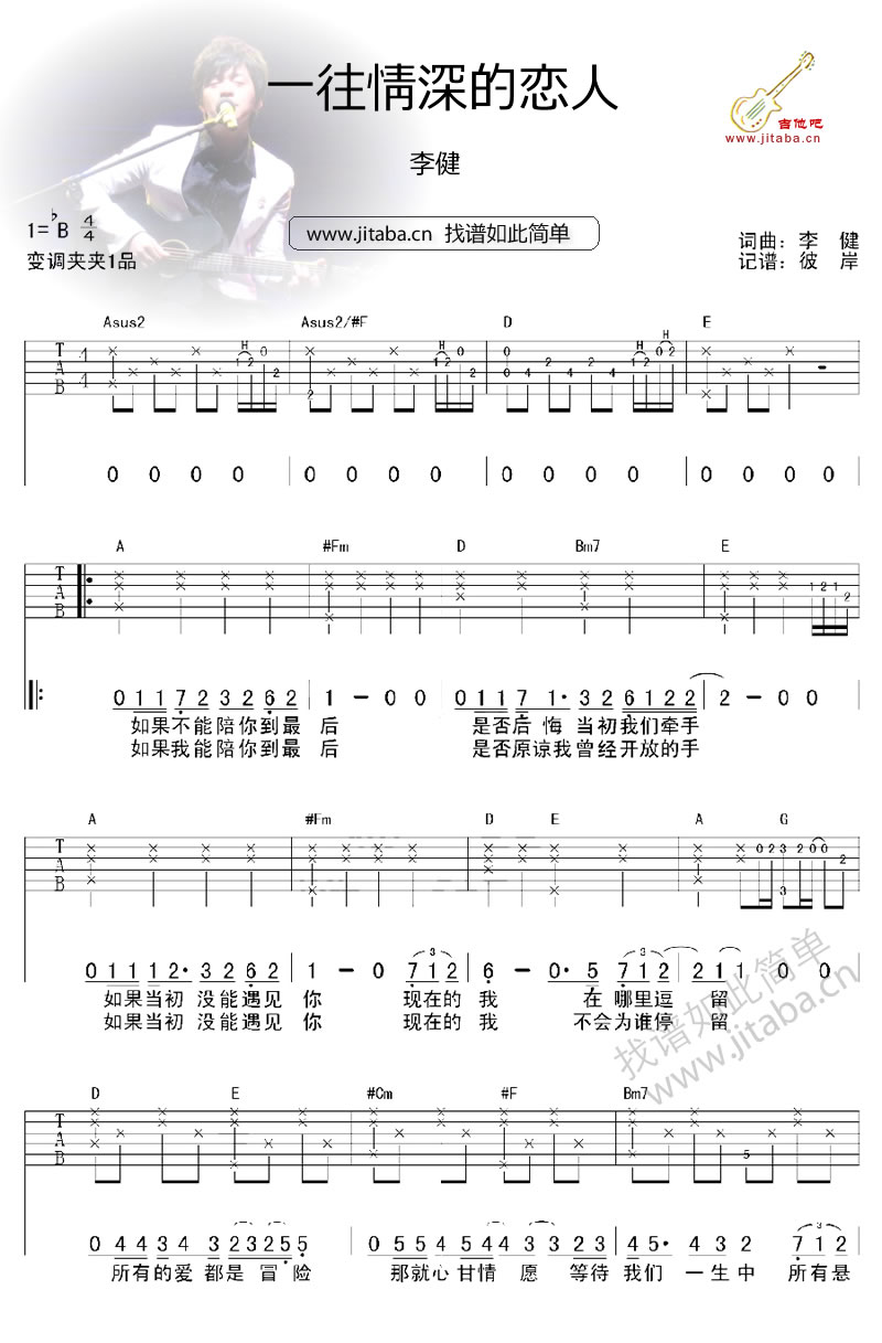 曲谱介绍: 李健一往情深的恋人吉他谱,变调夹夹第一品,六线谱图片谱。曲风空灵悠扬,这首歌轻吟浅唱了曾经沧海,诉说着你我的内心,浓浓的化不开的旋律在心里回旋, “所有的爱都是冒险 那就心甘情愿等待我们一生中所有悬念”, 有时候会问,没力气的时候 还这么心甘情愿么?