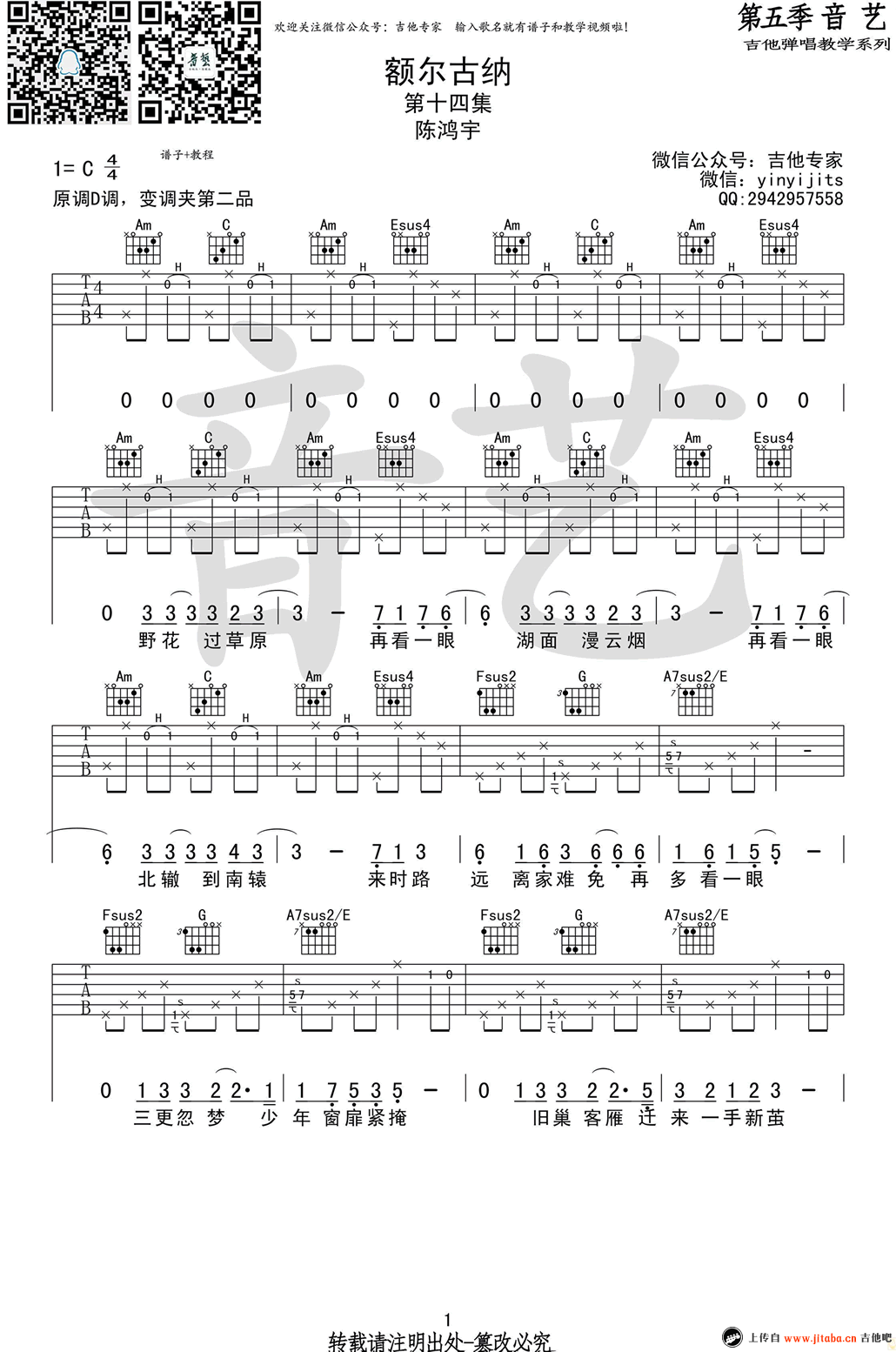 曲谱介绍: 陈鸿宇《额尔古纳》吉他谱,原调D变调夹夹第二品,选用C调指法。额尔古纳吉他弹唱谱,原版六线谱。曲谱为音艺吉他编配,四张图片谱两页显示。在歌者低沉磁性嗓音里,讲述了关于故乡的故事。白衣少年曾背着吉他,唱着理想三旬,如今人生几近三旬,回望故土,一晃又一眼,归途蜿蜒,离家在外,故乡难归,但年少时的模样永远留在那里。