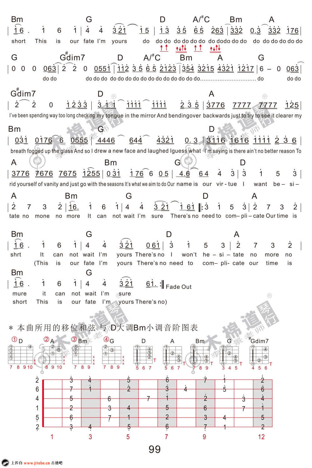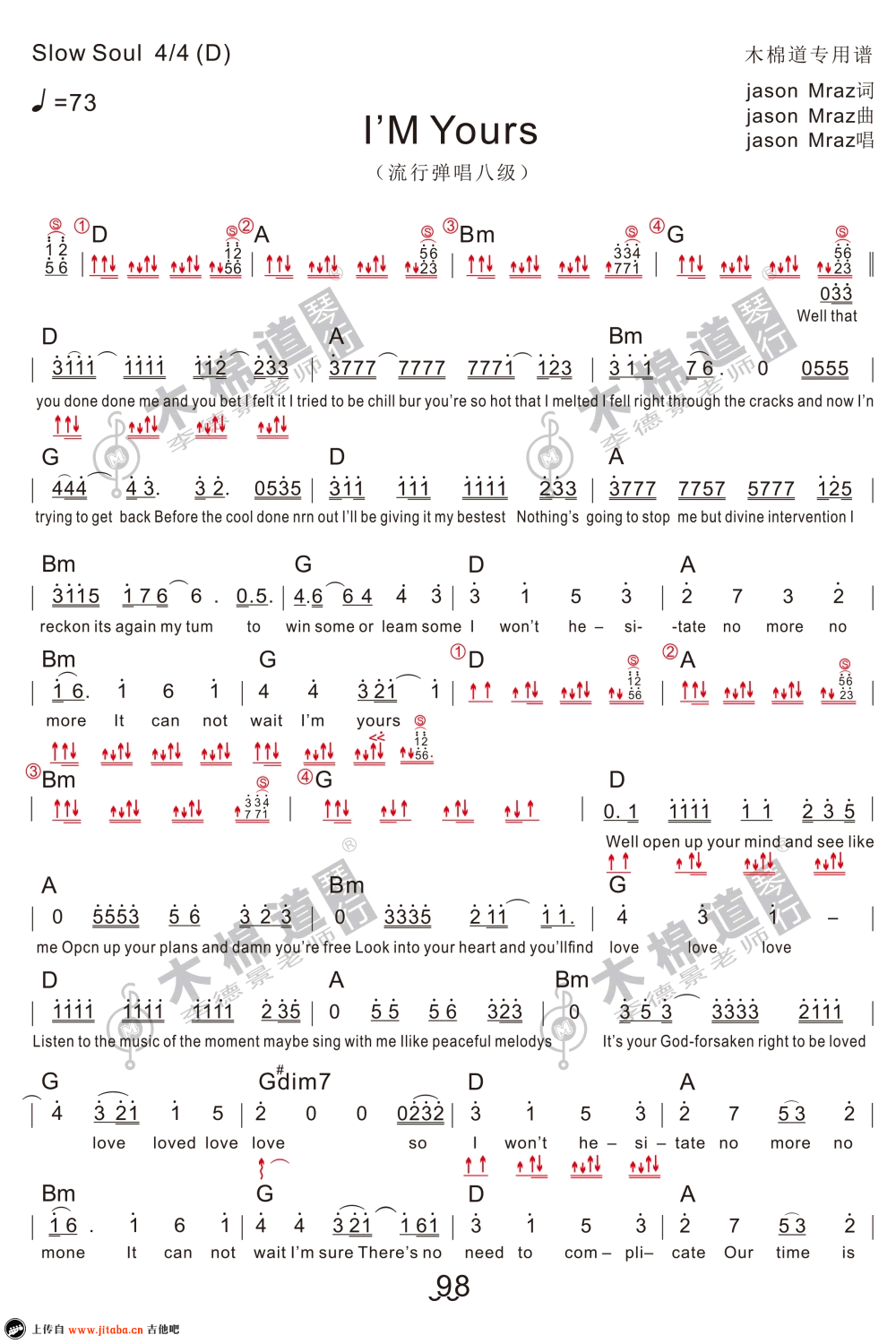 曲谱介绍: I'm yours吉他谱,(杰森·玛耶兹;男巫)演唱的一首英文流行金曲,I'm yours吉他谱,图片谱格式,曲谱为木棉道四合一专用曲谱,具体指法说明琴友们可以参照下面的说明。很喜欢I’m yours这首歌,不仅因为歌词写的很好,更是因为这首歌整个吉他的旋律很轻快,诉说出了爱慕之情。