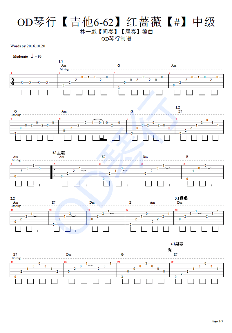 曲谱介绍: 丽江小倩《红蔷薇》吉他谱,带间奏尾奏编曲,红蔷薇吉他谱中级版本,感谢OD琴行制谱分享。丽江小倩的一首很抒情,很忧伤的歌。干净轻柔,唱出了时光的情意。其实每个人的心里,总有自己的深不见底。歌曲适合吉他弹唱,随谱放上示范视频,琴友们可以参照练习。