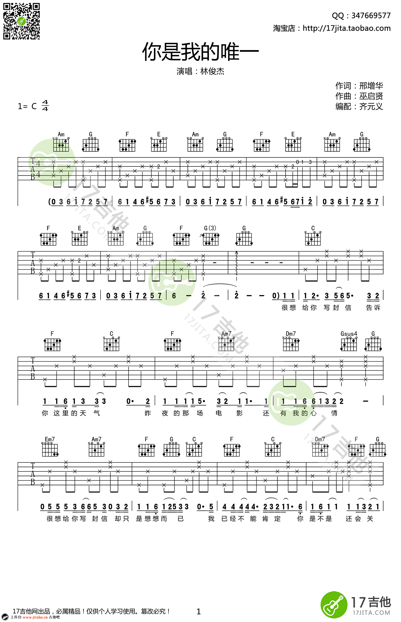 曲谱介绍: 你是我的唯一吉他谱,林俊杰《梦想的声音》翻唱版,你是我的唯一六线谱,C调指法编配,三张图片谱高清版。歌曲原唱是新加坡歌手巫启贤,一首老歌在木吉他的伴奏声中,唱出不一样的韵味。好多年前,巫启贤与林俊杰也曾经同台现场演唱了这首歌曲,看到那段视频忍不住感叹,音乐穿梭在这时间的长河里,带着最初的希冀随着时间流逝,停停走走,走到哪哪里都可以是终点。