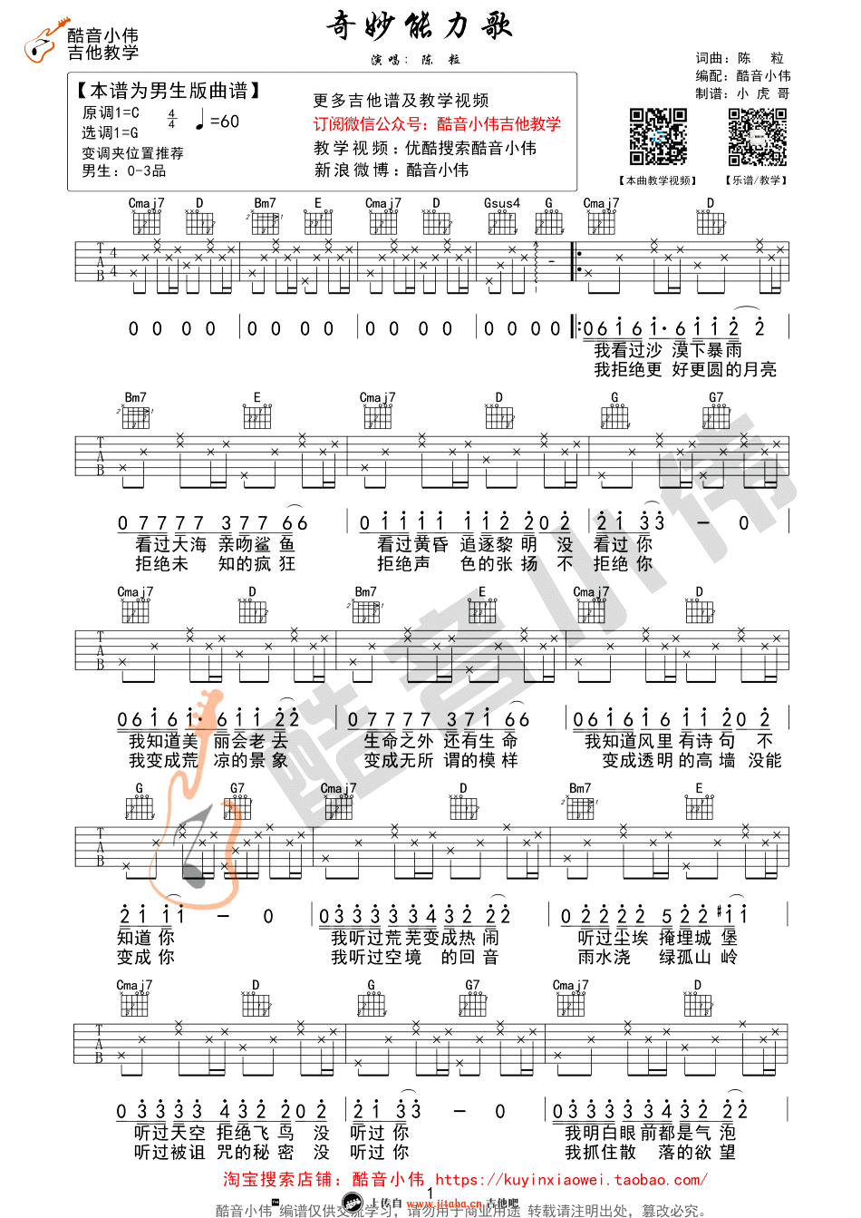 曲谱介绍: 奇妙能力歌吉他谱,陈粒演唱,奇妙能力歌六线谱,G调男生版,CAPO0-3品。感谢酷音小伟提供曲谱和吉他弹唱教学视频。喜欢这首好听民谣歌曲的朋友,可以参照视频讲解学习。