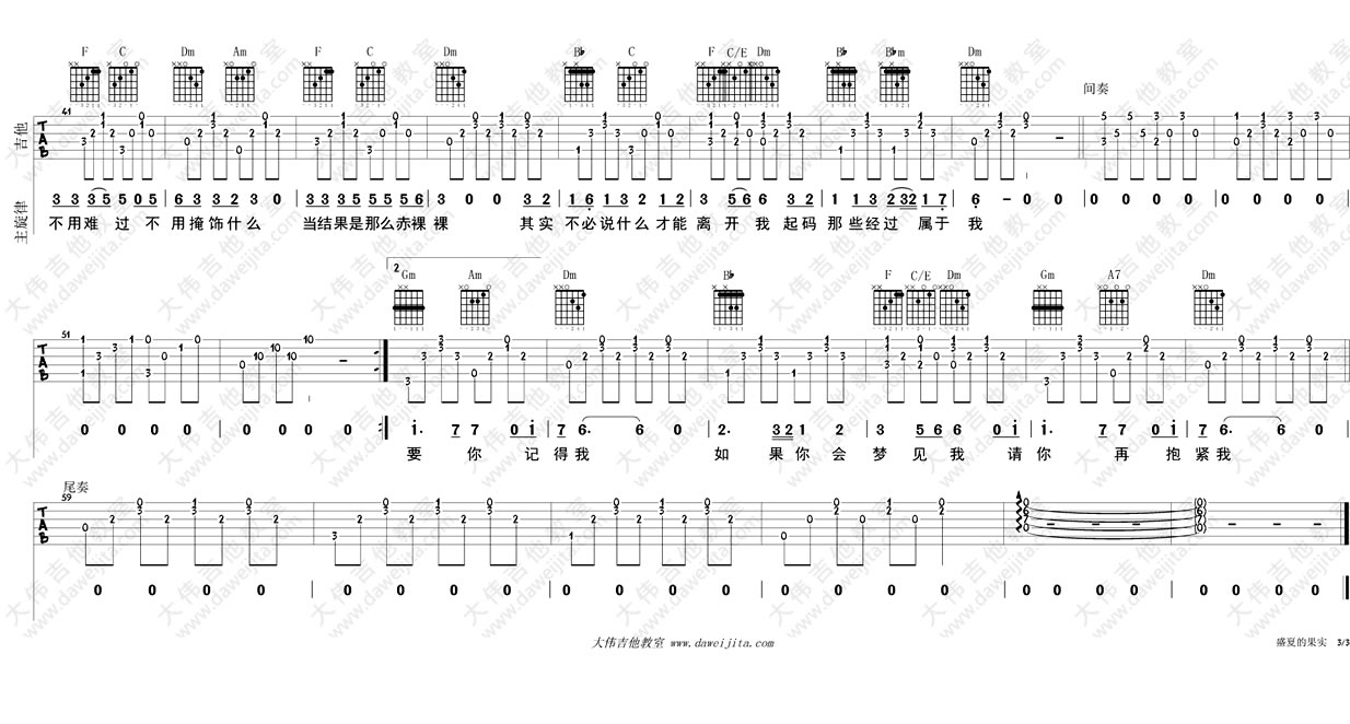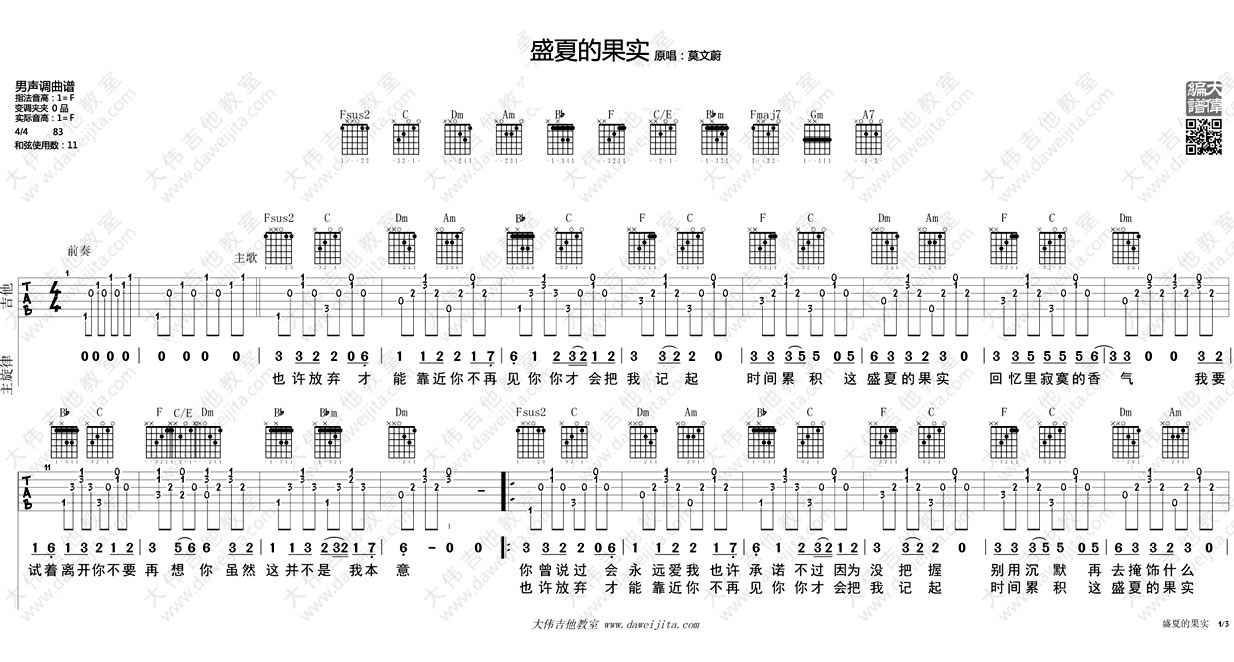 曲谱介绍: 盛夏的果实吉他谱,男生版本曲谱,指法音高F,速度每分钟83拍,前奏两个小节,曲谱根据莫文蔚原曲改编,感谢大伟老师编配并为琴友们带来《盛夏的果实》吉他弹唱教学讲解示范。亲爱的夏至未至,久违了。看到你,我记忆深处的帷幕由此被缓缓拉开,曾在故事结尾处刹那回响的旋律也被按下播放键。那是一首合上书便情不自禁哼出的歌。如今你以时光缱绻、宁静美好的姿态出现在触手可及的地方,可不可以恳请你将它从岁月长河中也一并带来?《盛夏的果实》吉他谱送给你。