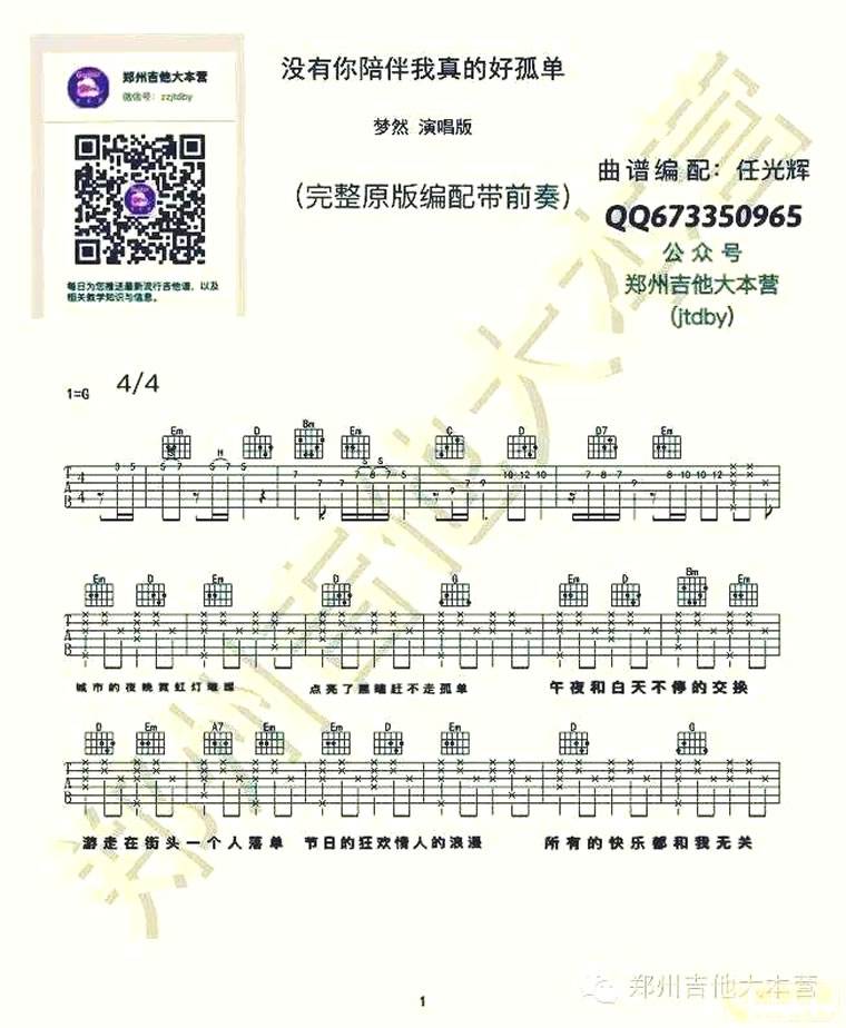 曲谱介绍: 没有你陪伴我真的好孤单吉他谱,完整原版编配带前奏,梦然演唱,一首旋律忧伤的网络歌曲,没有你陪伴我真的好孤单吉他六线谱,感谢郑州吉他大本营分享曲谱。一首好听的歌曲,送给孤单的你我他。