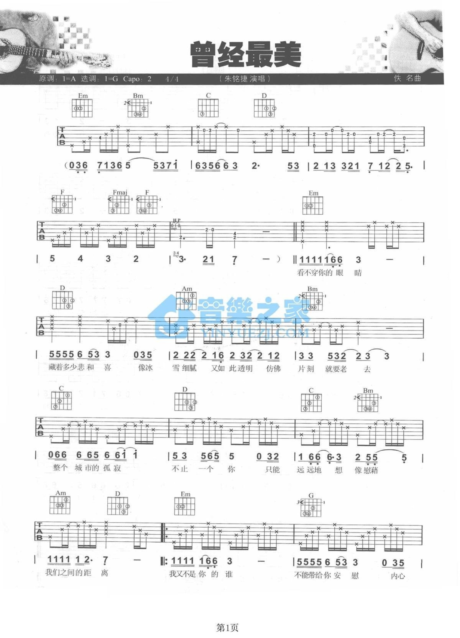 曲谱介绍: G调版 朱铭捷《曾经最美》吉他弹唱六线谱