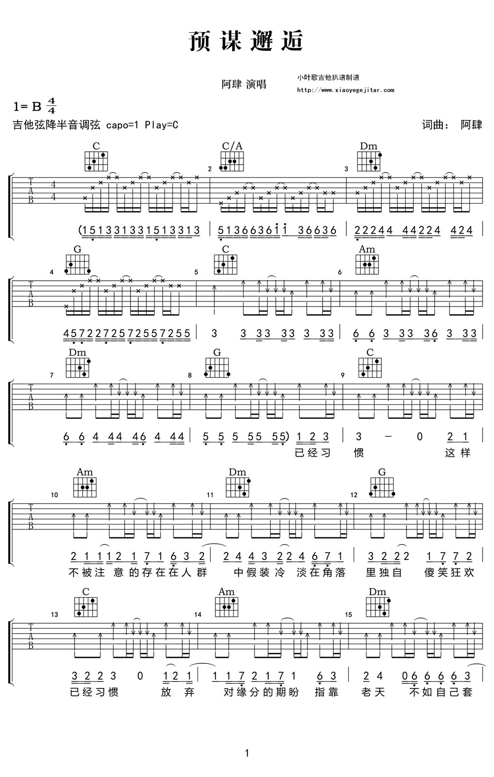 曲谱介绍: 阿肆预谋邂逅吉他谱,原调B,吉他弦降半音调弦,变调夹夹一品,选调C指法。预谋邂逅六线谱,弹唱谱高清版共五张图片谱例,曲谱分两页展示。感谢小叶歌吉他编配分享。我很喜欢预谋邂逅这首歌,喜欢阿肆用懒散的调子唱出那些其实没可能的预谋。城市太大,让所有的邂逅都变得来不及,任凭你预谋。