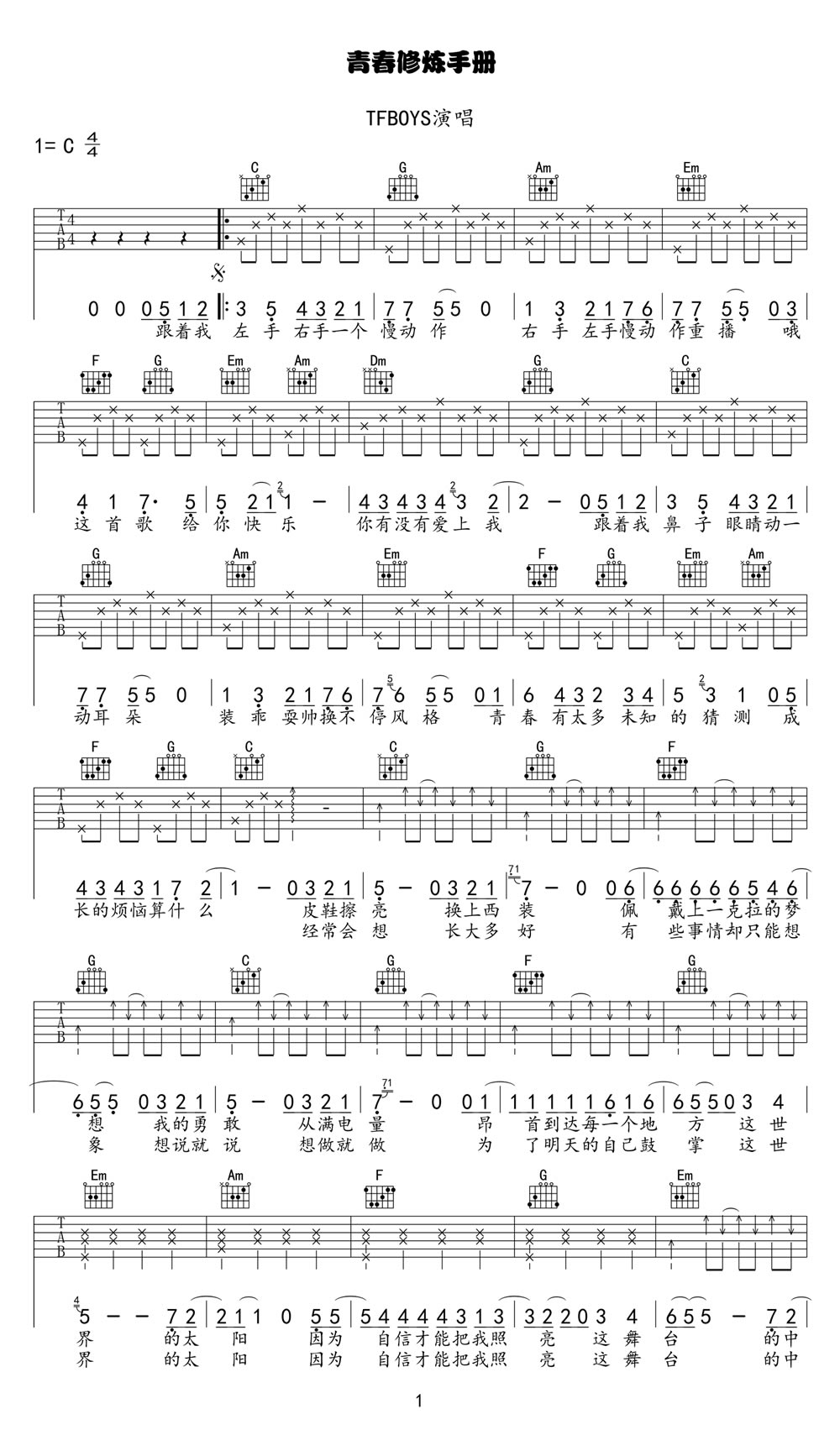 青春修炼手册吉他谱 - TFBOYS - C调吉他弹唱谱