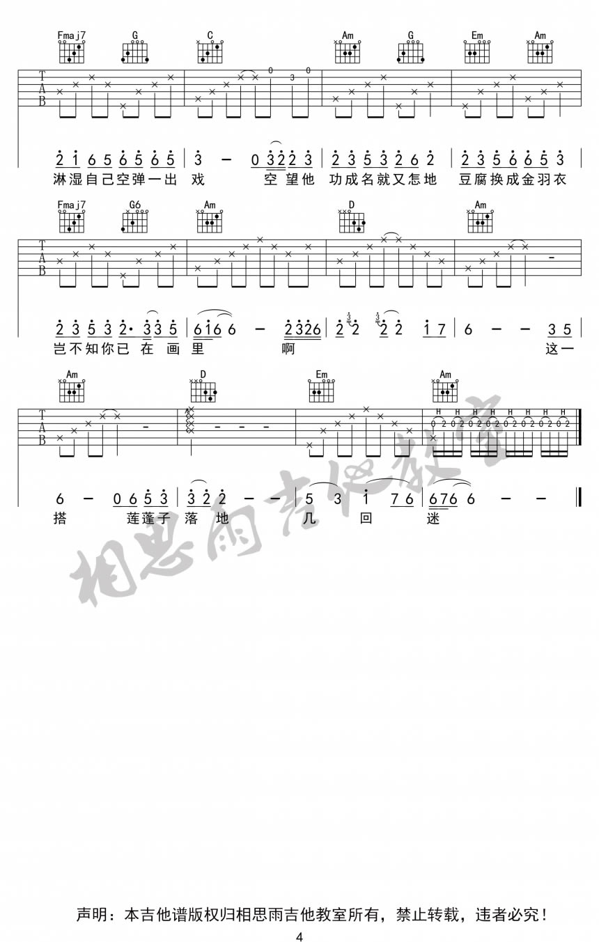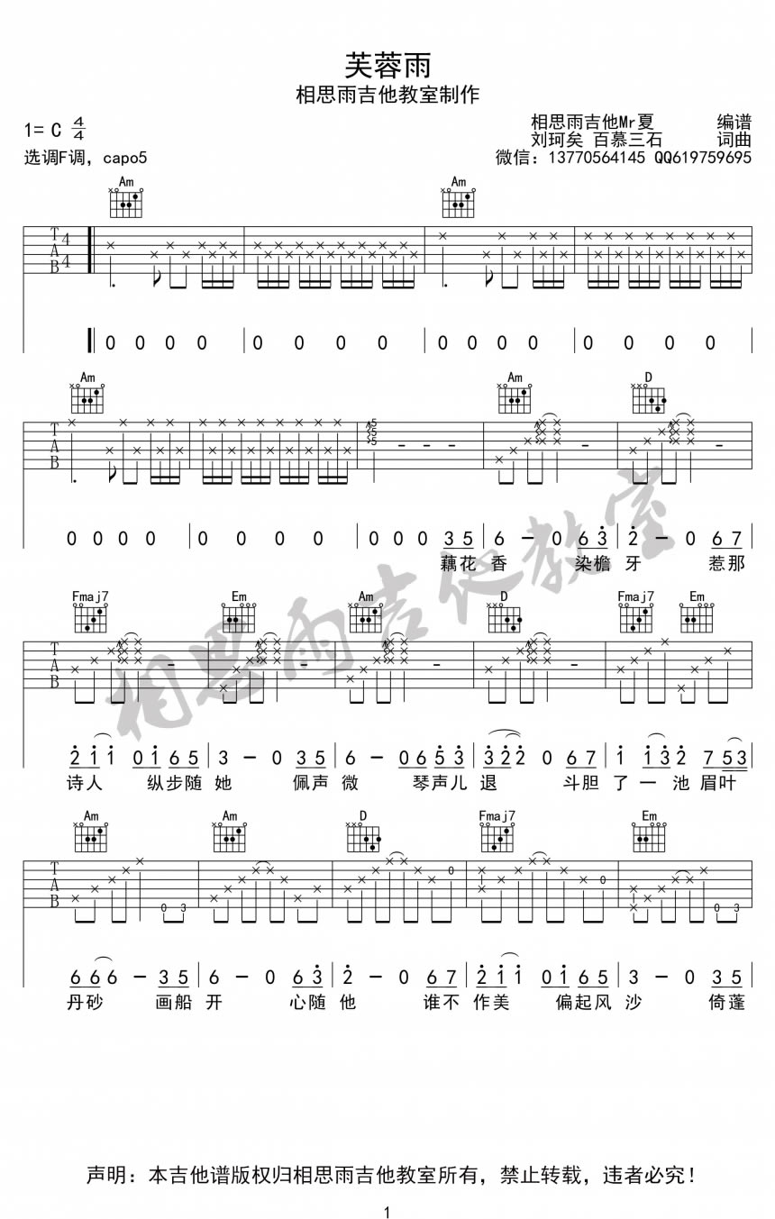 曲谱介绍: 刘珂矣芙蓉雨吉他谱,Capo夹五品,芙蓉雨吉他弹唱六线谱,完整版共四张图片谱例。曲谱由相思雨吉他教室制作,Mr夏编谱。芙蓉雨吉他谱,歌曲是刘珂矣演唱,天簌之音,穿越古今,忘尘谷中半壶纱,芙蓉雨外一袖云。