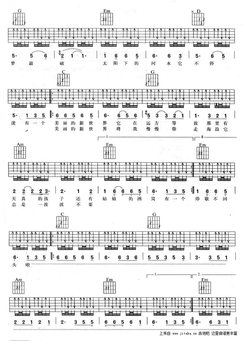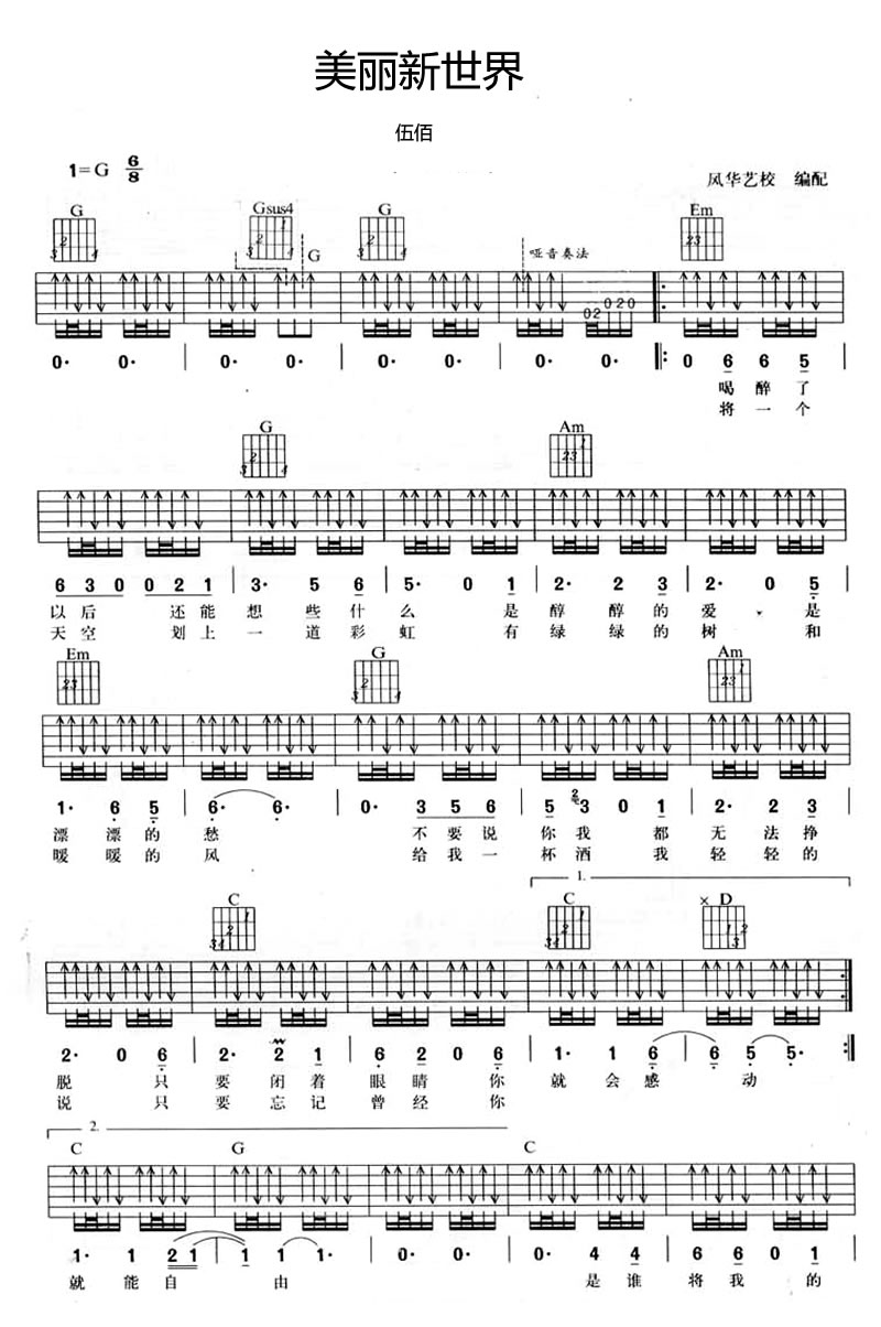 曲谱介绍: 伍佰美丽新世界吉他谱,G调编配六线谱,美丽新世界吉他谱,弹唱图片谱,伍佰的一首老歌,经典的东西不会随着时间流逝而褪色,99年姜武陶红电影《美丽新世界》的同名插曲,伍佰饰演一个被撵来撵去的在地下通道唱歌的歌手。本曲谱根据原版编配,演奏时候注意哑音效果。