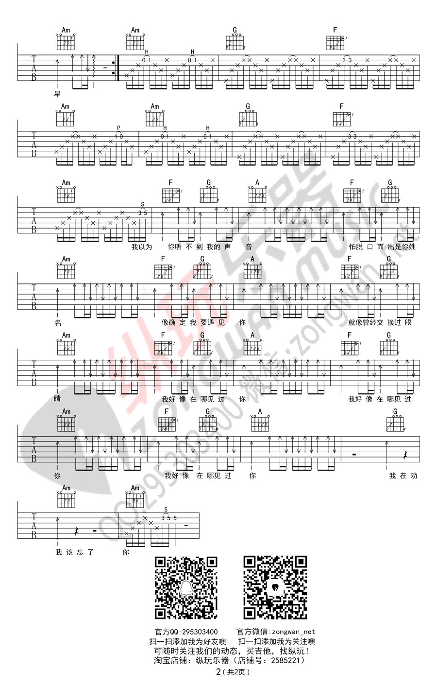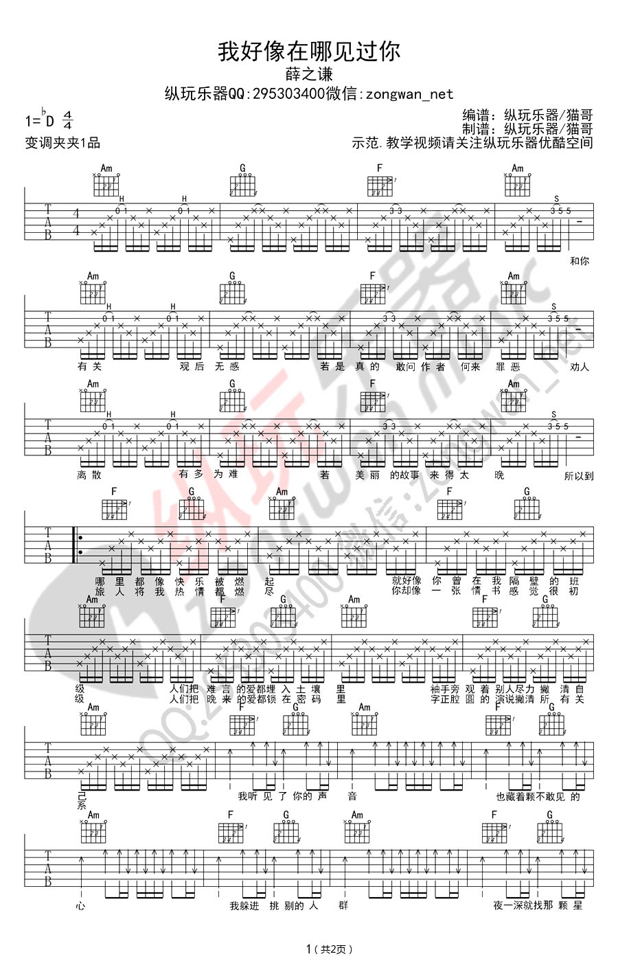 曲谱介绍: 我好像在哪见过你吉他谱,薛之谦深情演唱精灵王座主题曲,延续了薛氏情歌的绵绵情意。我好像在哪见过你六线谱,CAPO夹一品,两张图片谱子,感谢纵玩乐器编配制谱。