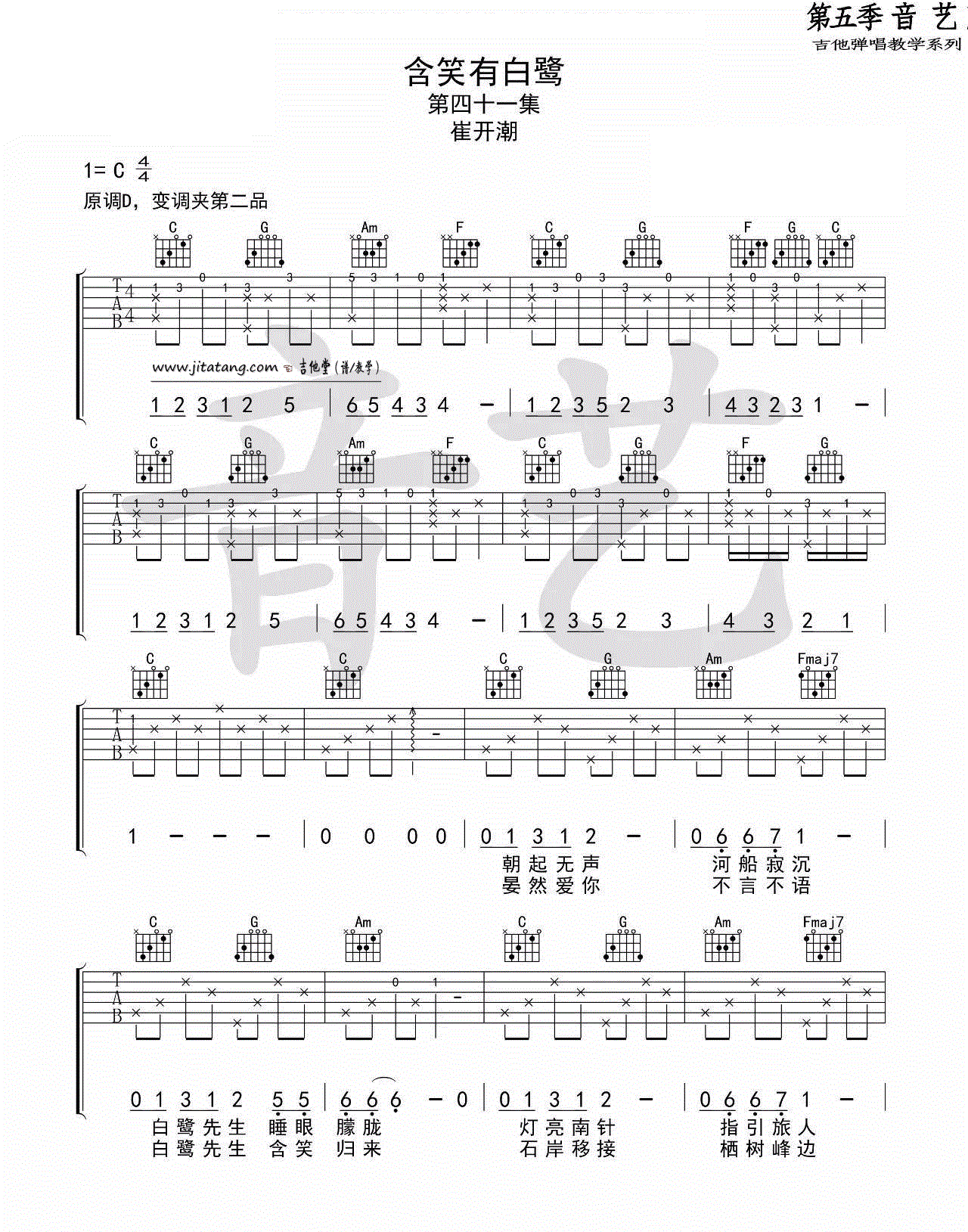 含笑有白鹭 崔开潮 C调六线吉他谱 - 含笑有白鹭 - C调吉他弹唱谱