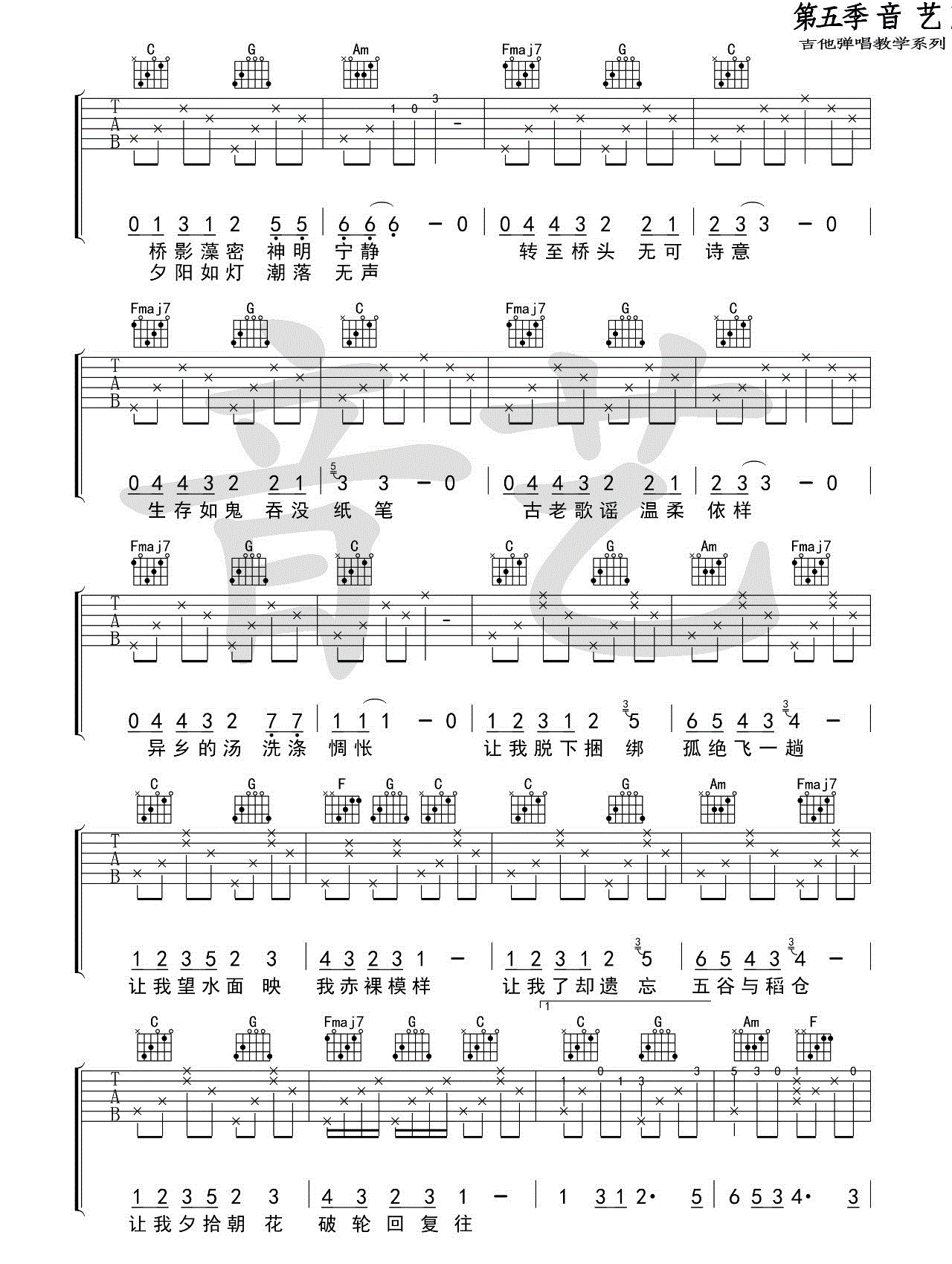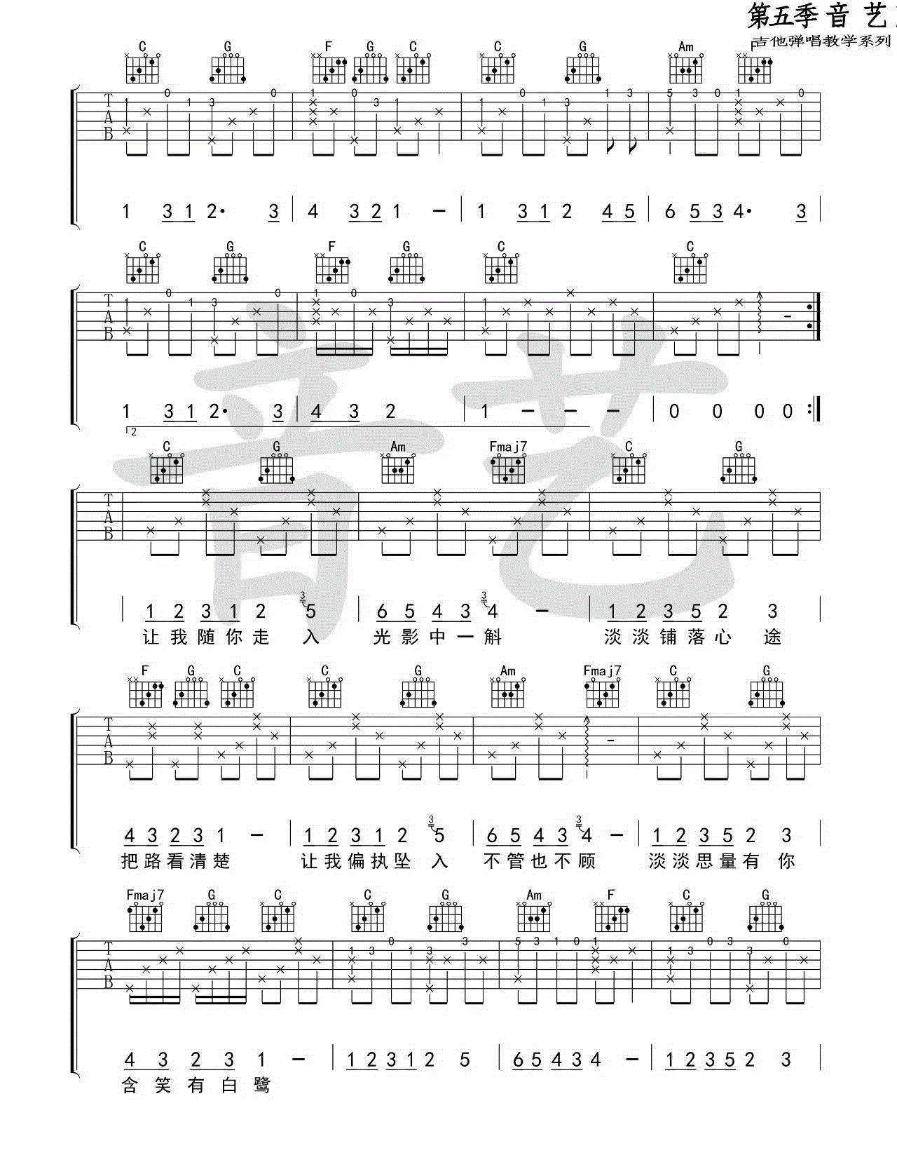当前位置:琴谱网>吉他弹唱>含笑有白鹭 崔开潮 C调六线