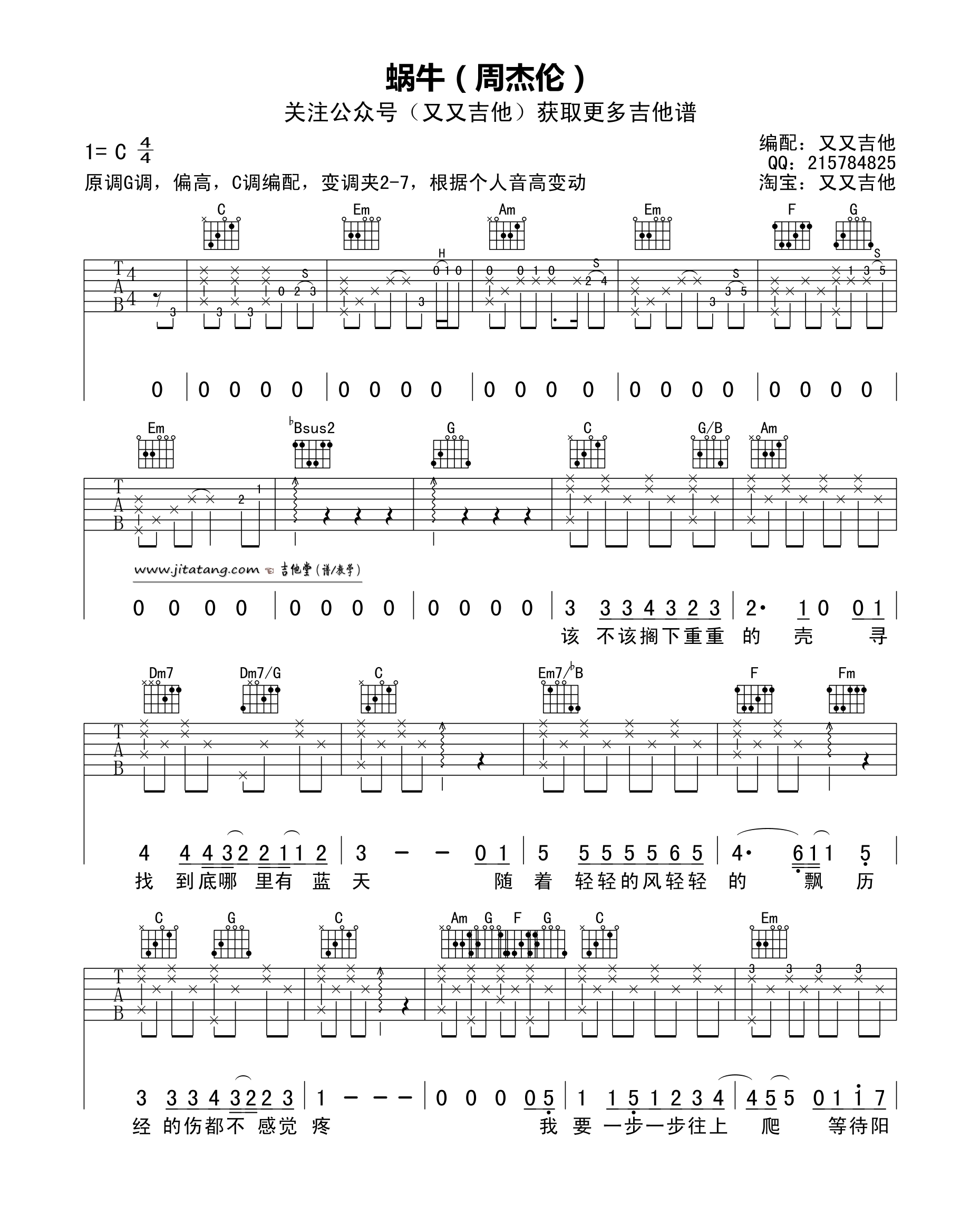 蜗牛 周杰伦 C调六线吉他谱 - 蜗牛 - C调吉他弹唱谱