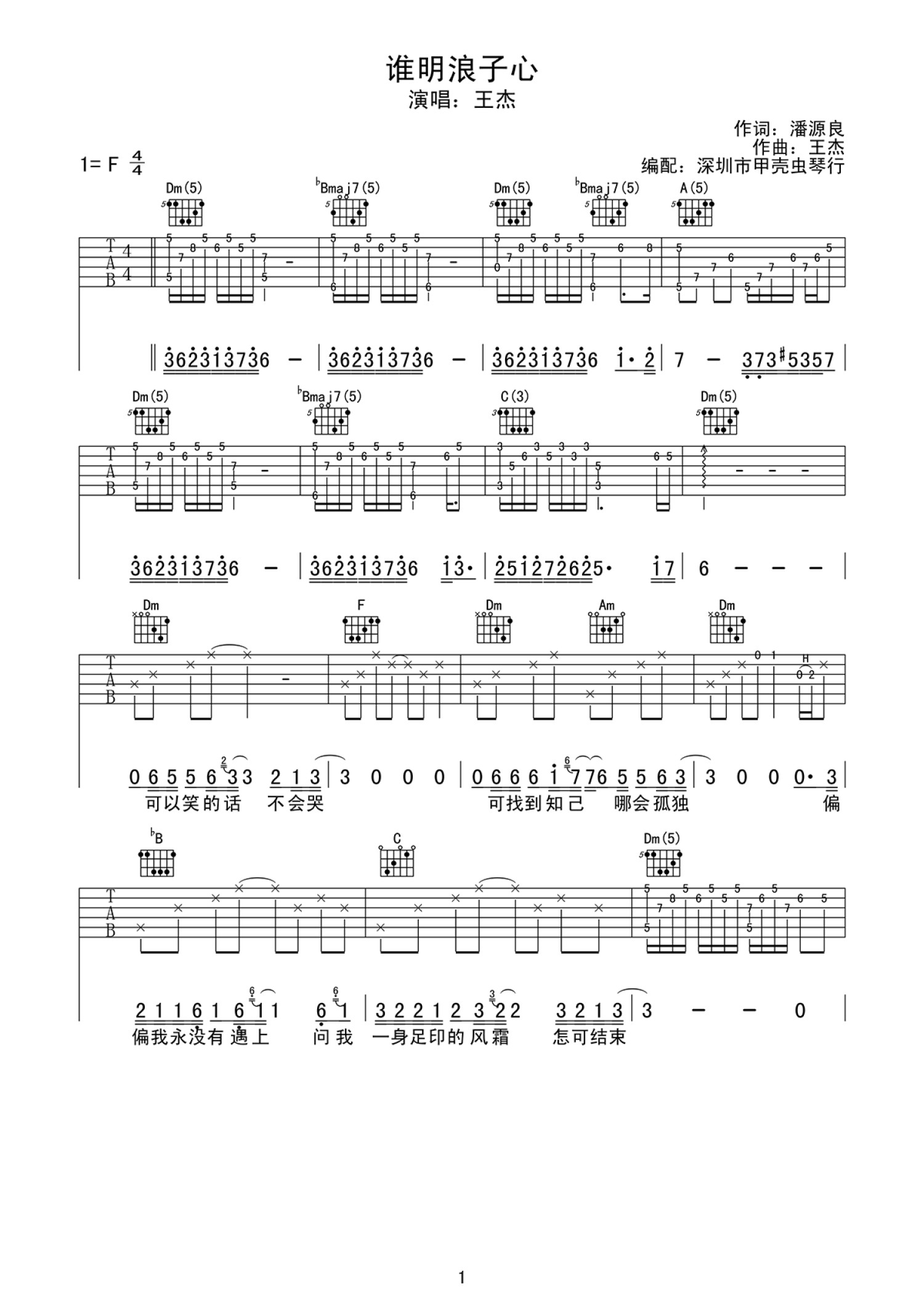 曲谱介绍: 谁明浪子心吉他谱,王杰《谁明浪子心》六线谱,含前奏、间奏、尾奏四张图片谱。一首经典粤语歌曲,国语版是王杰词曲的《她的背影》,流浪没有尽头,漂泊的浪子,在冷傲红尘的外表下,内心的孤独和柔情谁人能懂。