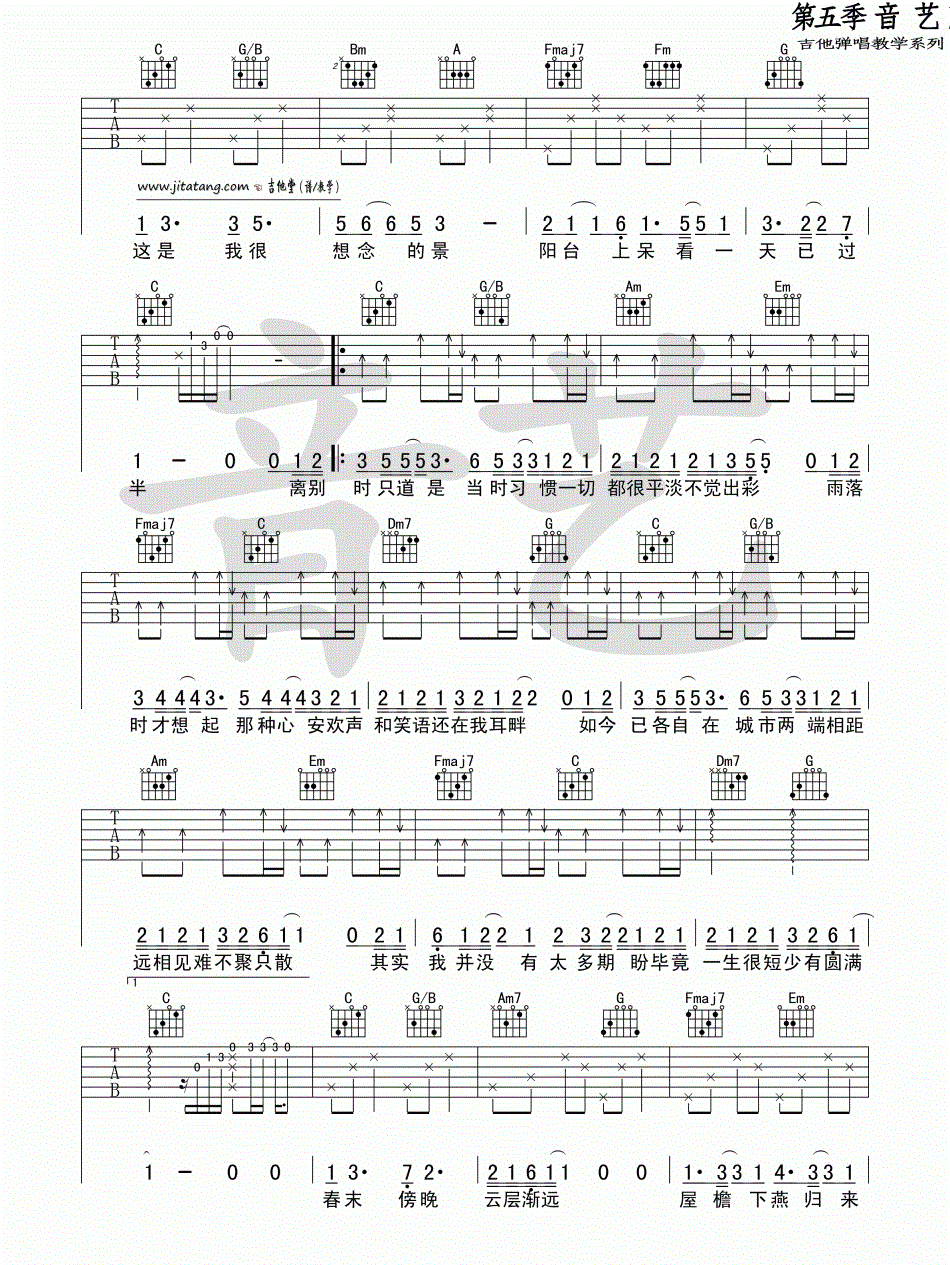 曲谱介绍: 《只道寻常》吉他谱,谢春花最新发布的一首歌,原曲#C调,音艺编配高清《只道寻常》C调吉他谱,变调夹夹第一品弹奏,歌曲原曲用的钢琴伴奏,在编配的时候有删减改编不算太难,C调歌曲里面巧妙的运用了Bm和A和弦,有功底的朋友可以好好体会它的和弦色彩,民谣歌曲里难得的佳作。歌曲讲的是久别家人后的念想,四段主歌的内容为春花记忆中在自家阳台上所见的四季之景,副歌所写是聚少离多的难解之忧,再无昔日的团圆可言。