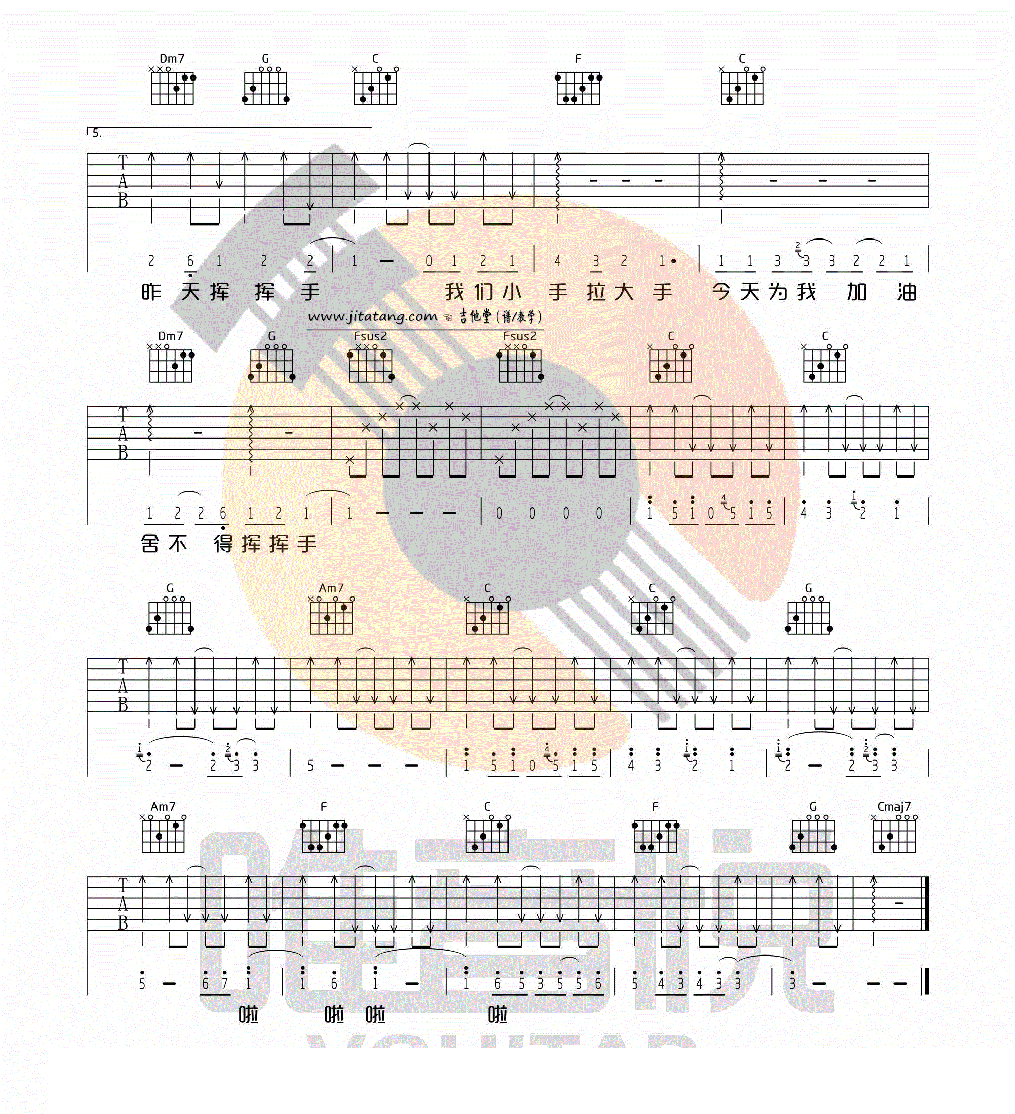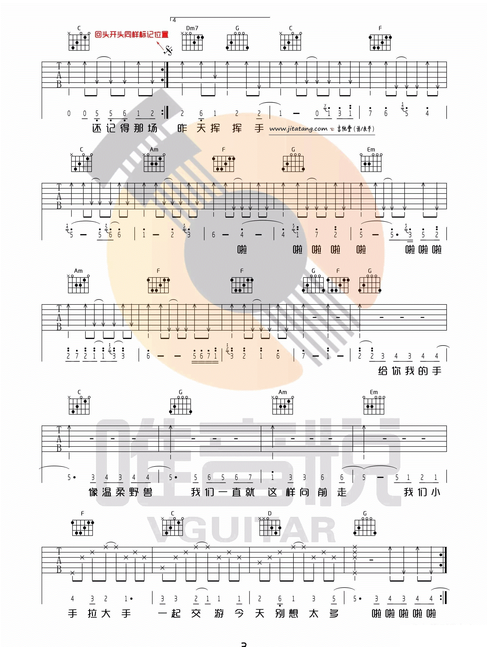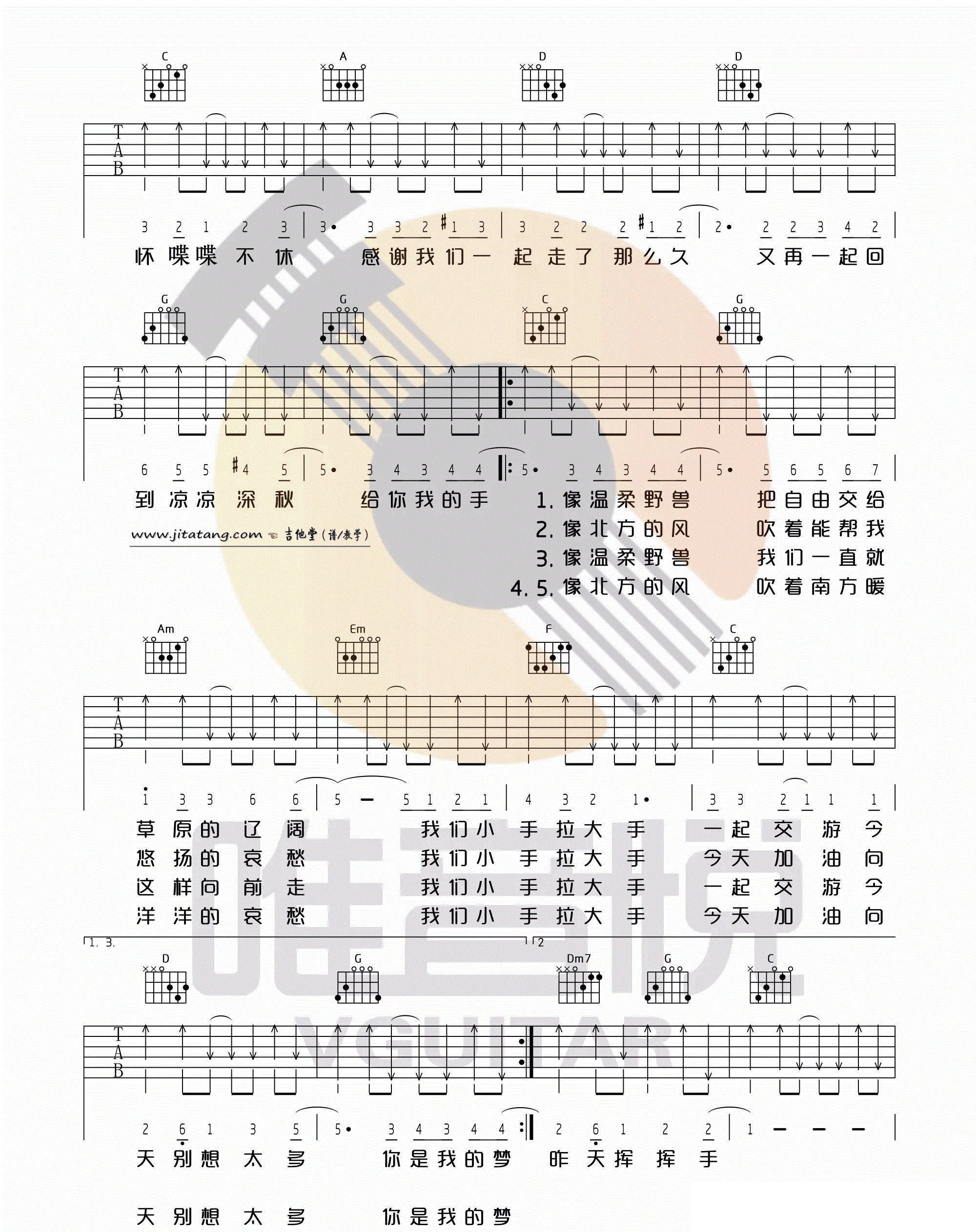 曲谱介绍: 《小手拉大手》高清C调吉他谱,梁静茹演唱,非常适合吉他和尤克里里的弹唱伴奏。另外这首歌还是由陈绮贞填词,翻唱自日语《幻化成风》,感谢唯音悦的制谱分享。