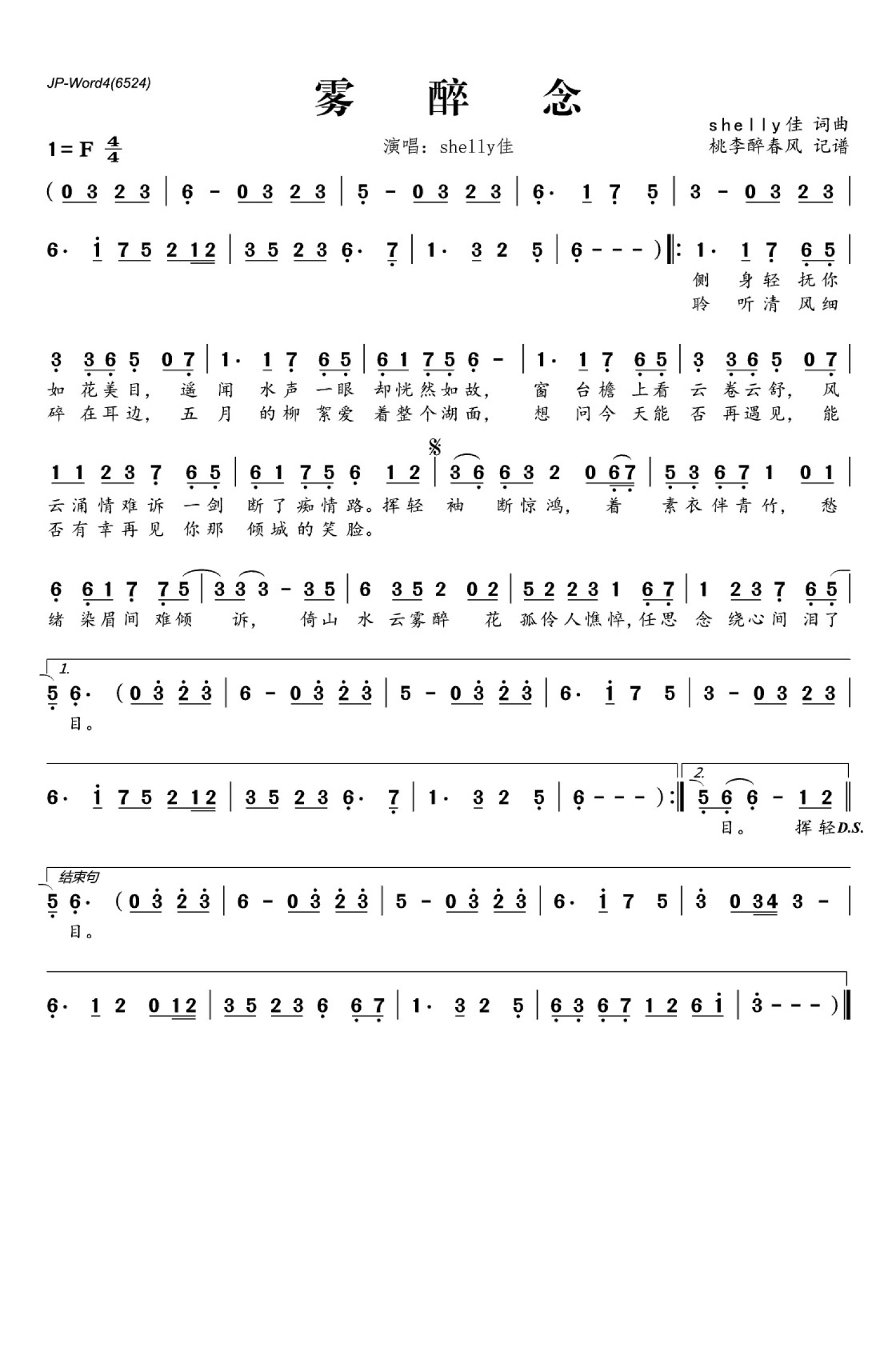 曲谱介绍: shelly佳《​雾醉念》歌词_简谱