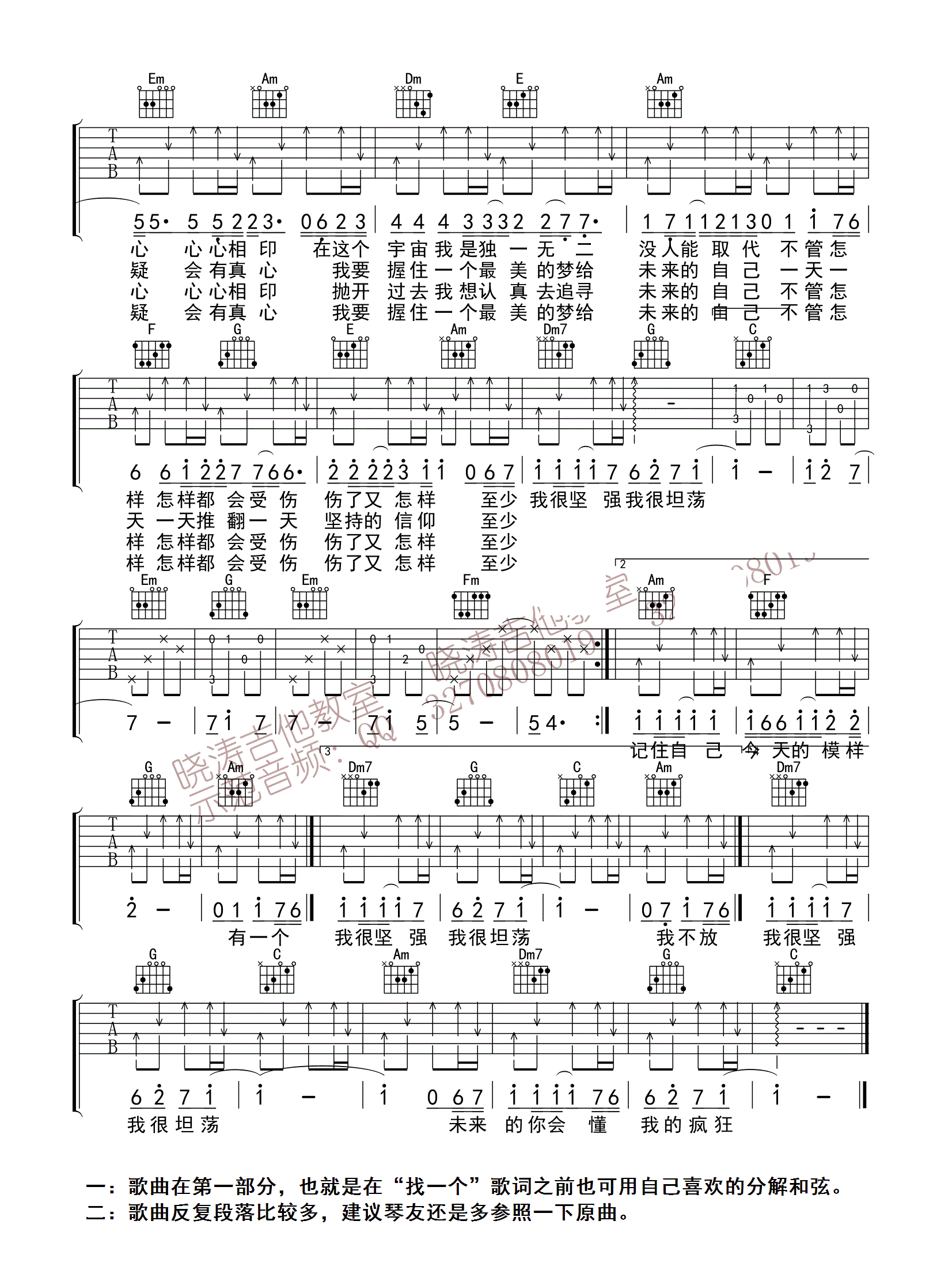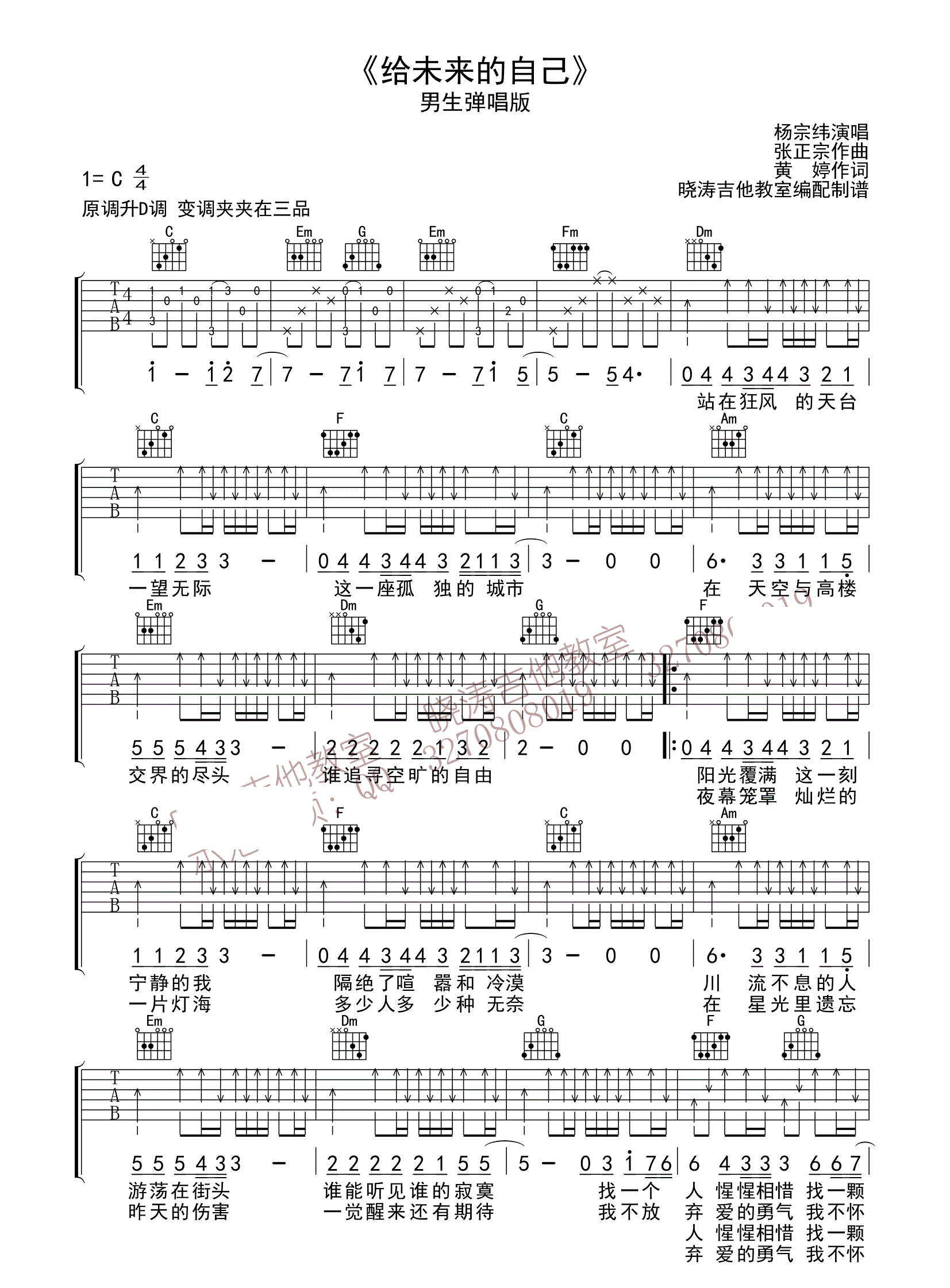 曲谱介绍: 《给未来的自己》吉他谱分享,杨宗纬版本,来自晓涛吉他编配制谱。这是杨宗纬在星空传奇演唱会上翻唱的一首梁静茹的歌,从一开始,他就眼含泪光,“不管怎样,怎样都会受伤, 伤了又怎样, 至少我很坚强,我很坦荡 。”追梦的路上我们都拼尽全力,愿未来的我们都能活出最美的自己。