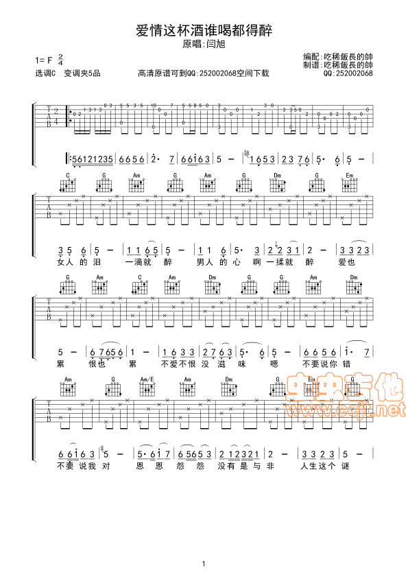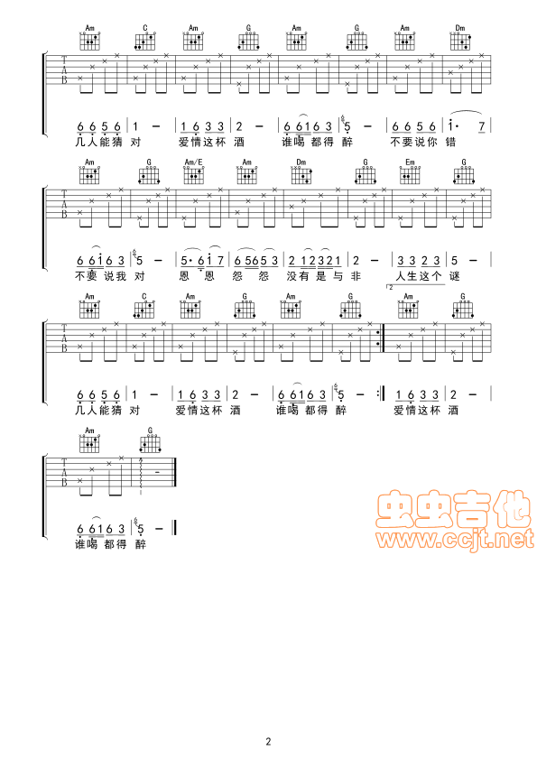曲谱介绍: 《爱情这杯酒谁喝都得醉》吉他弹唱谱,共有2张高清图谱,免翻页排版设计。