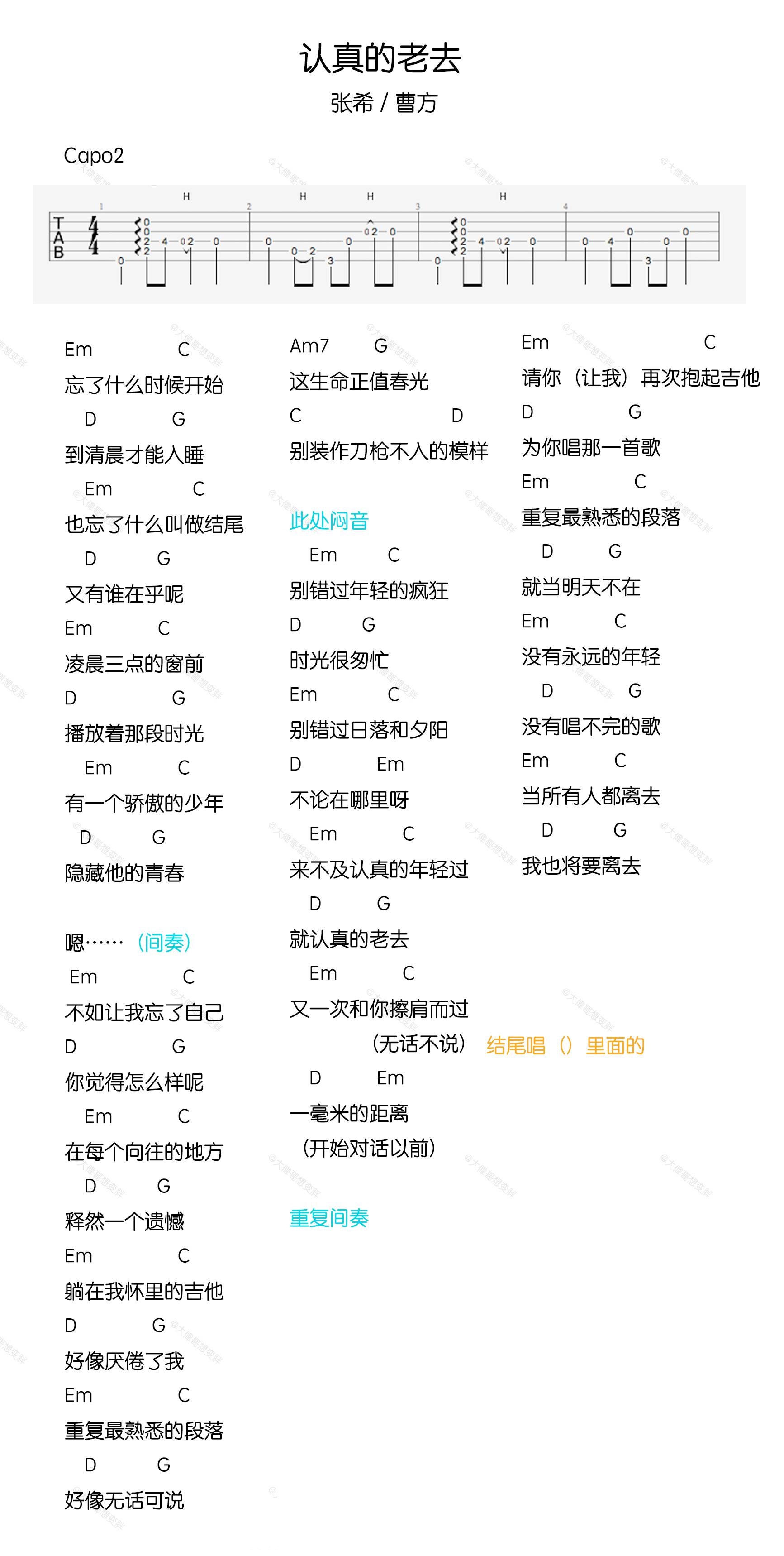 认真的老去 张希/曹方 图片吉他谱 - 认真的老去 - 吉他弹唱谱
