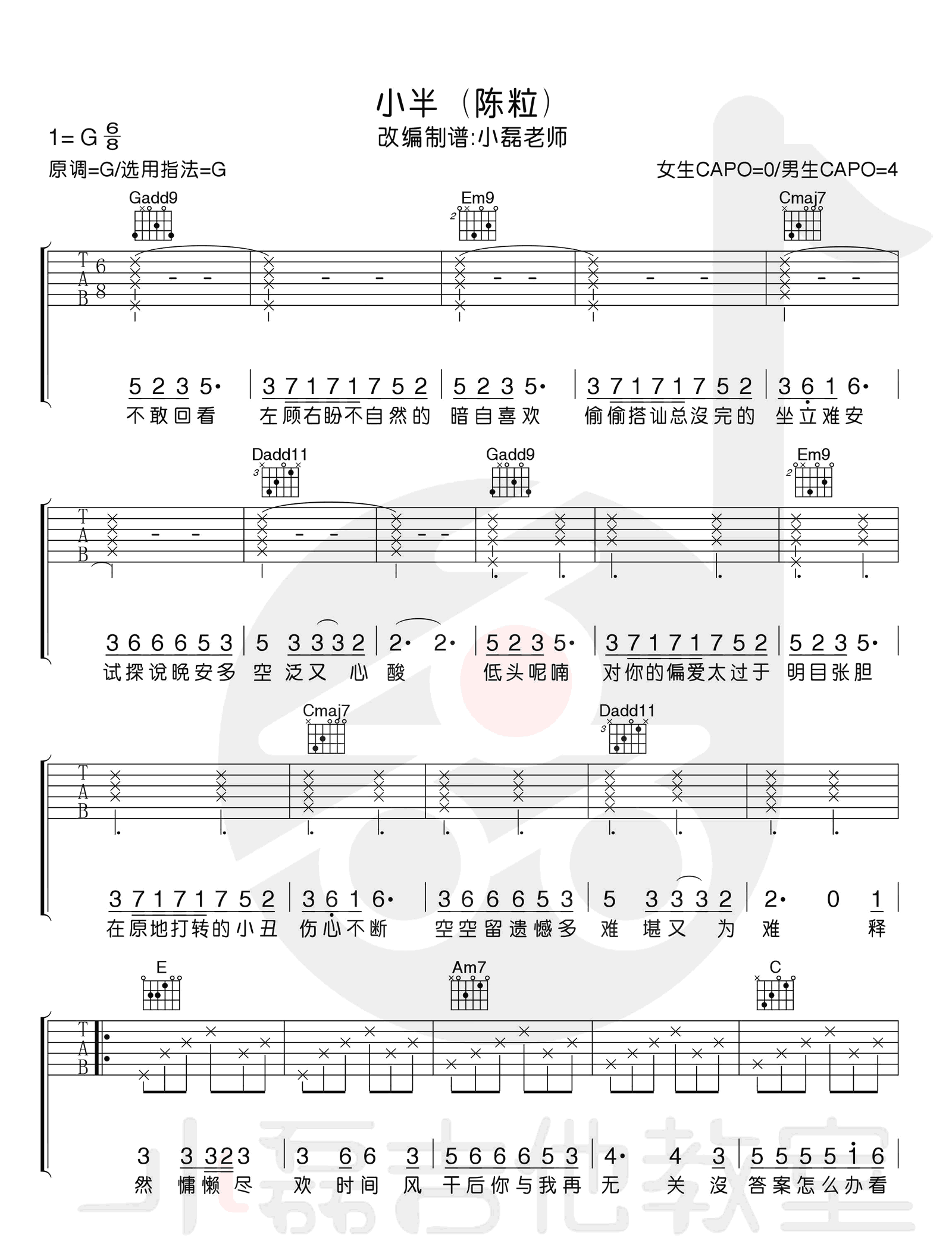 曲谱介绍: 《小半》吉他谱,G调指法弹唱谱,陈粒的一首民谣创作代表歌曲,小半六线谱,四张高清图片谱,感谢小磊吉他编配出品,琴谱网网站推荐分享。本次教学我们讲解一首陈粒的《小半》,这是一首6/8的歌曲,这首歌的和弦都比较简单,并且变化也非常有规律,后段的6/8拍扫弦比较不常见,大家对这个扫弦方式不是很熟练的同学需要练习一下!前段的分解没有什么难度,各位同学要结合原版的唱调和歌词铿锵有力的唱法,仔细学习一下哦! 难度:5级