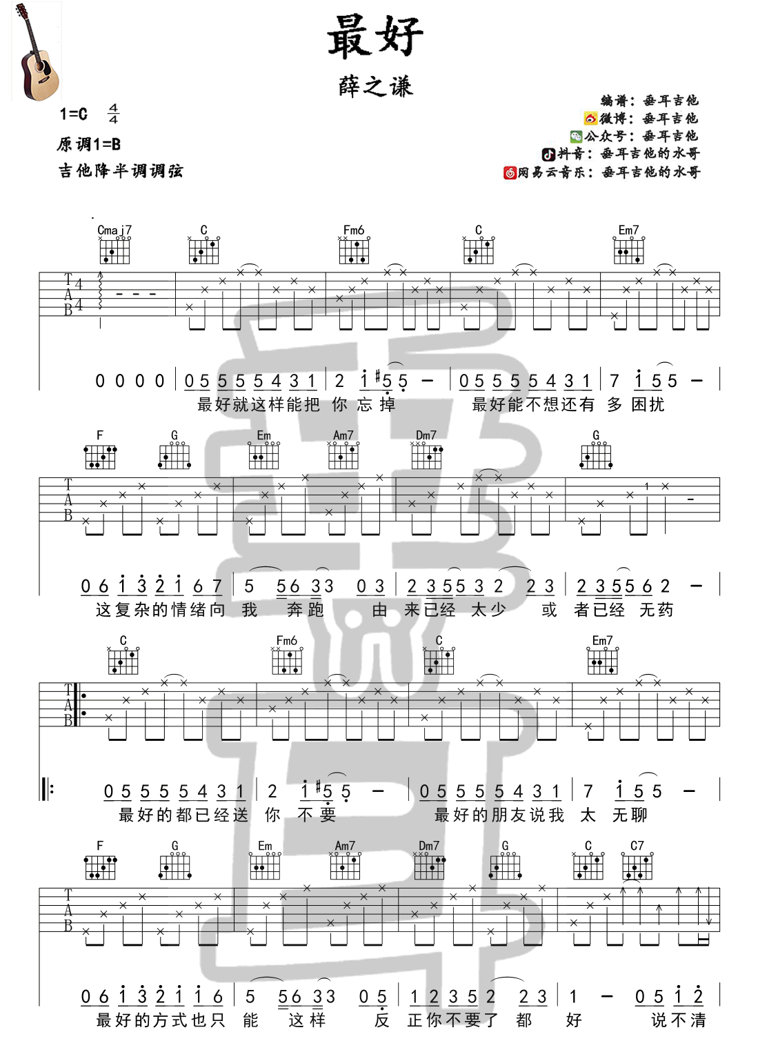 曲谱介绍: 薛之谦《最好》吉他谱,原调B,选用C调指法,吉他降半调调弦。一首深情的薛氏情歌,歌声让人感伤悲悯。同时也让我们从中得以思考体会,得以总结成长,得以继续向前。最好六线谱,吉他弹唱图片谱。感谢垂耳吉他编配,随谱附上水哥带来的曲谱配套吉他弹唱教学,琴友们跟随老师的讲解示范练习起来吧。