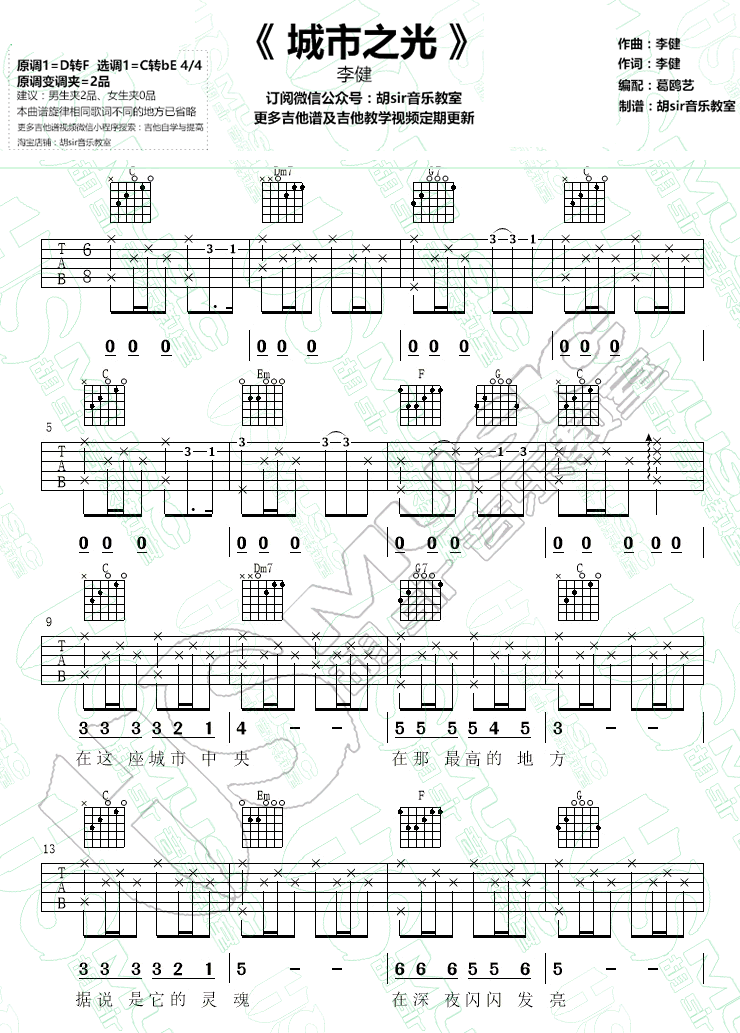 曲谱介绍: 李健《城市之光》吉他谱,电影 《心理罪之城市之光》 主题曲,词曲演唱李健,原调D转F调,选调C转bE,变调夹推荐,男生夹2品。城市之光六线谱,胡sir音乐教室编配出品。   悠远纯净带画面感的歌声,很容易将听者带入到故事情节中,瞬间入戏,歌曲舒缓不乏高亢,柔情又有力量。城市之光应该照耀它所有的人,无论日与夜。