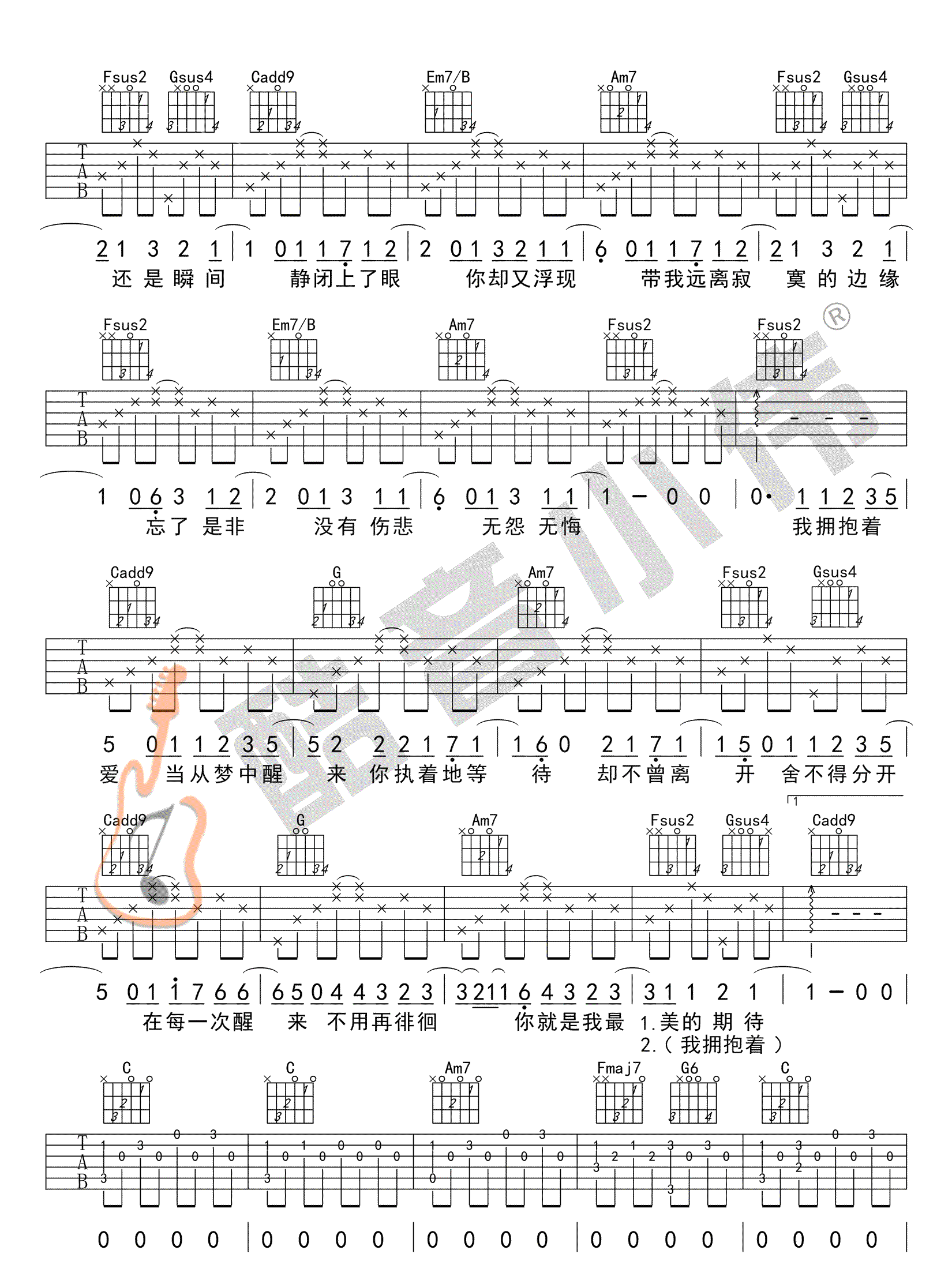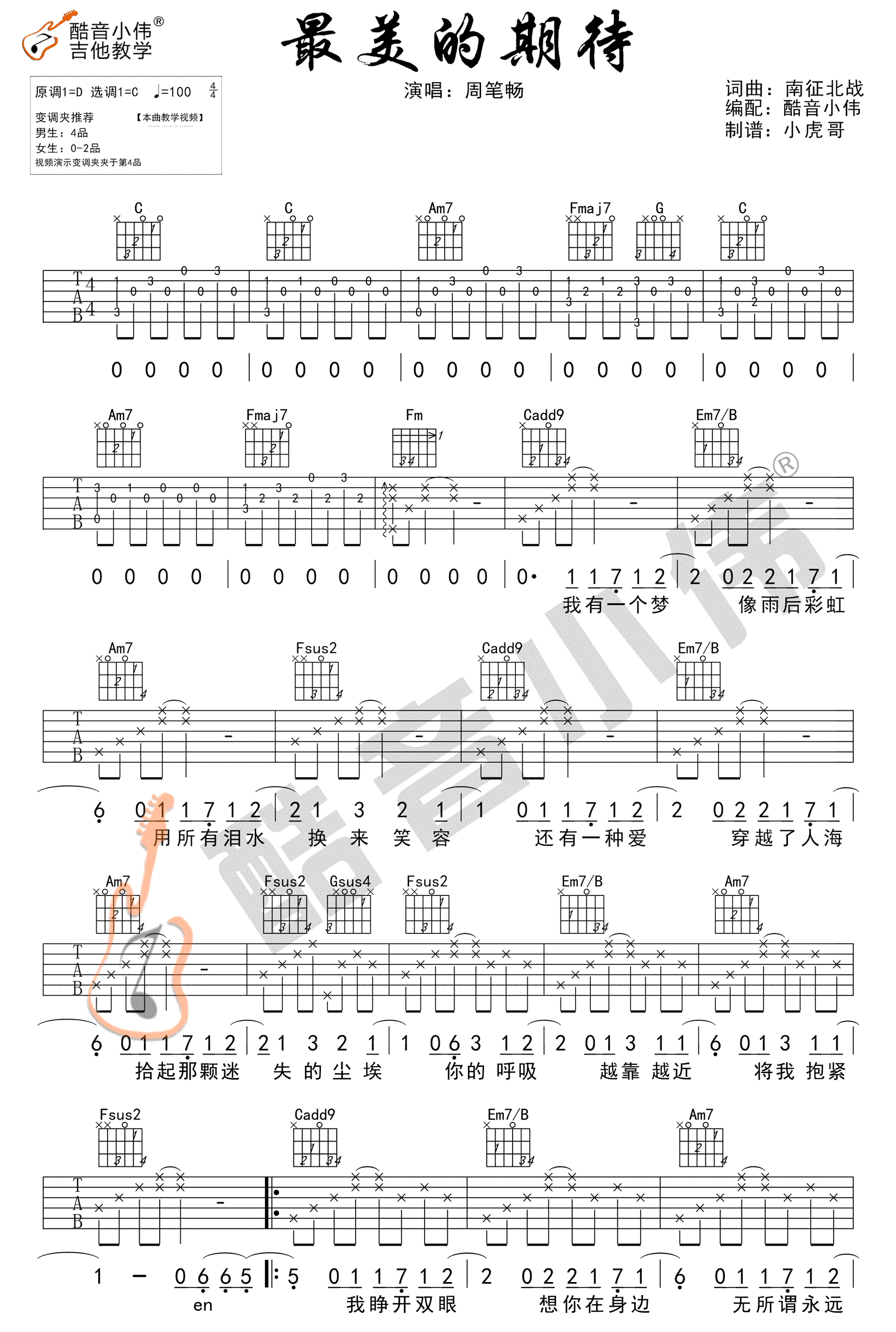 曲谱介绍: 最美的期待吉他谱,原调D,C调指法中级版,变调夹推荐位置,男生第四品,女生可以0-2品。周笔畅《最美的期待》六线谱,高清弹唱图片谱。酷音小伟编配出品。