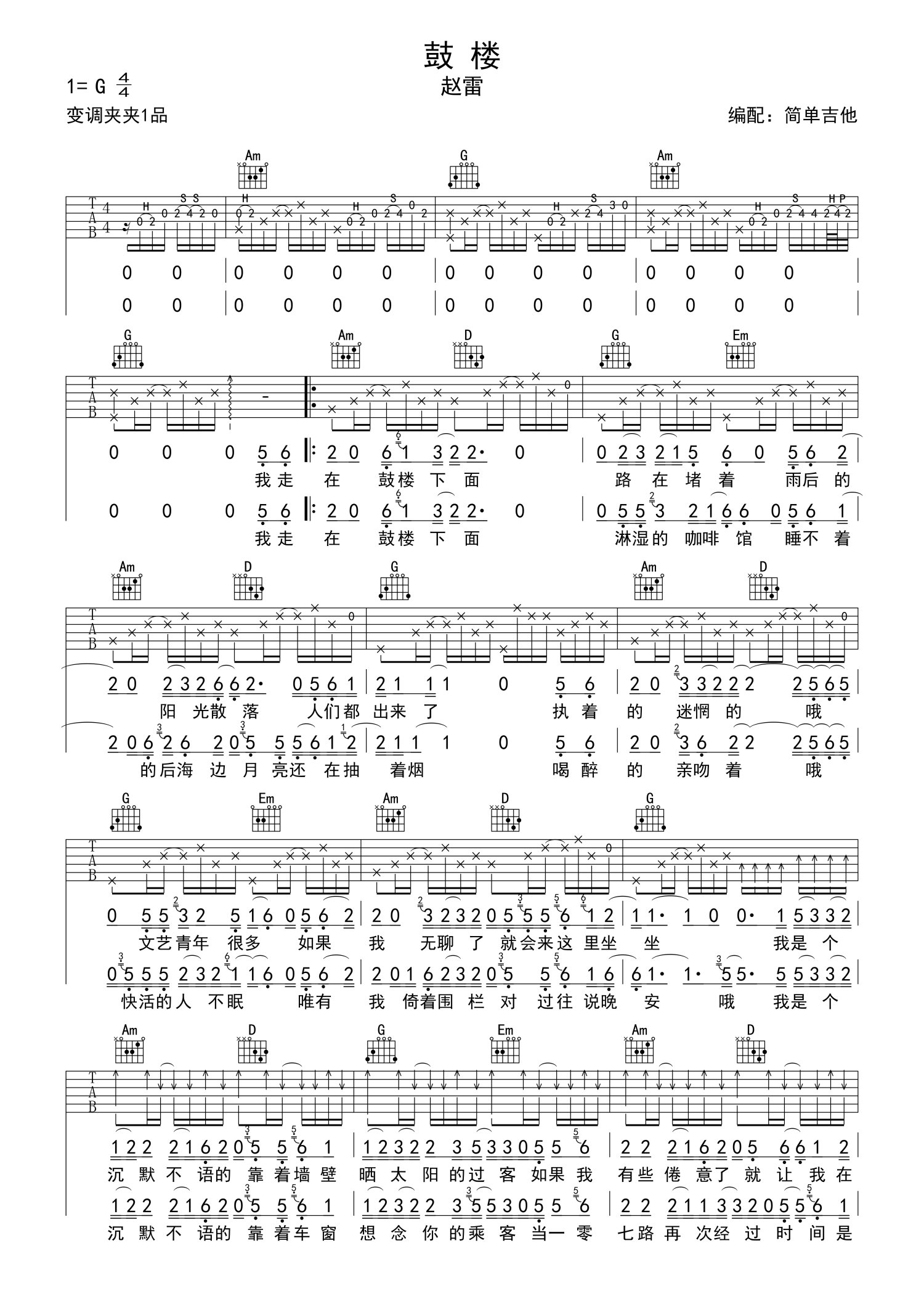 • 鼓楼吉他谱 - 赵雷 - G调吉他弹唱谱 - 原版第1张