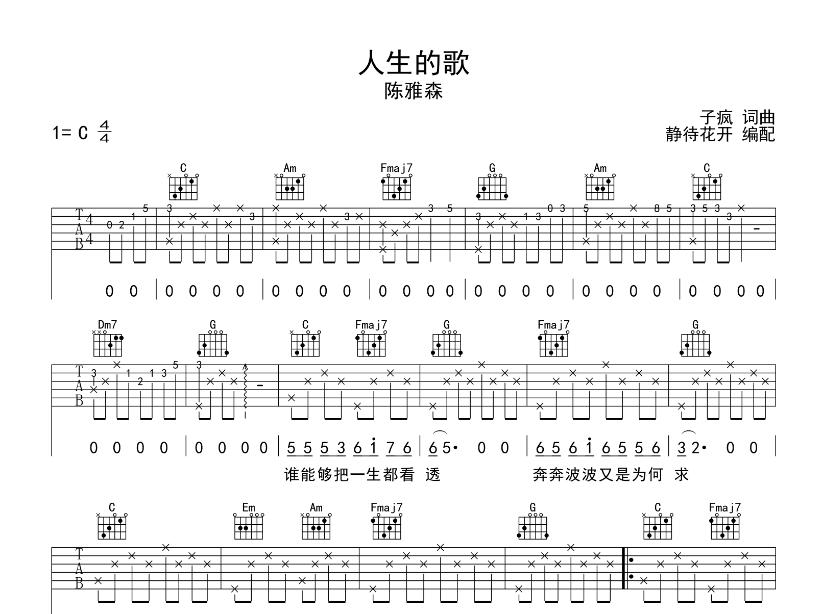 曲谱介绍: 人生的歌吉他谱,陈雅森演唱,《人生的歌》吉他弹唱谱,编配制作选用C调和弦指法,原调编配不夹变调夹,琴友们也可根据个人情况选择变调夹,适合自己音高即可,演奏速度每分钟80拍,整体难度简单。