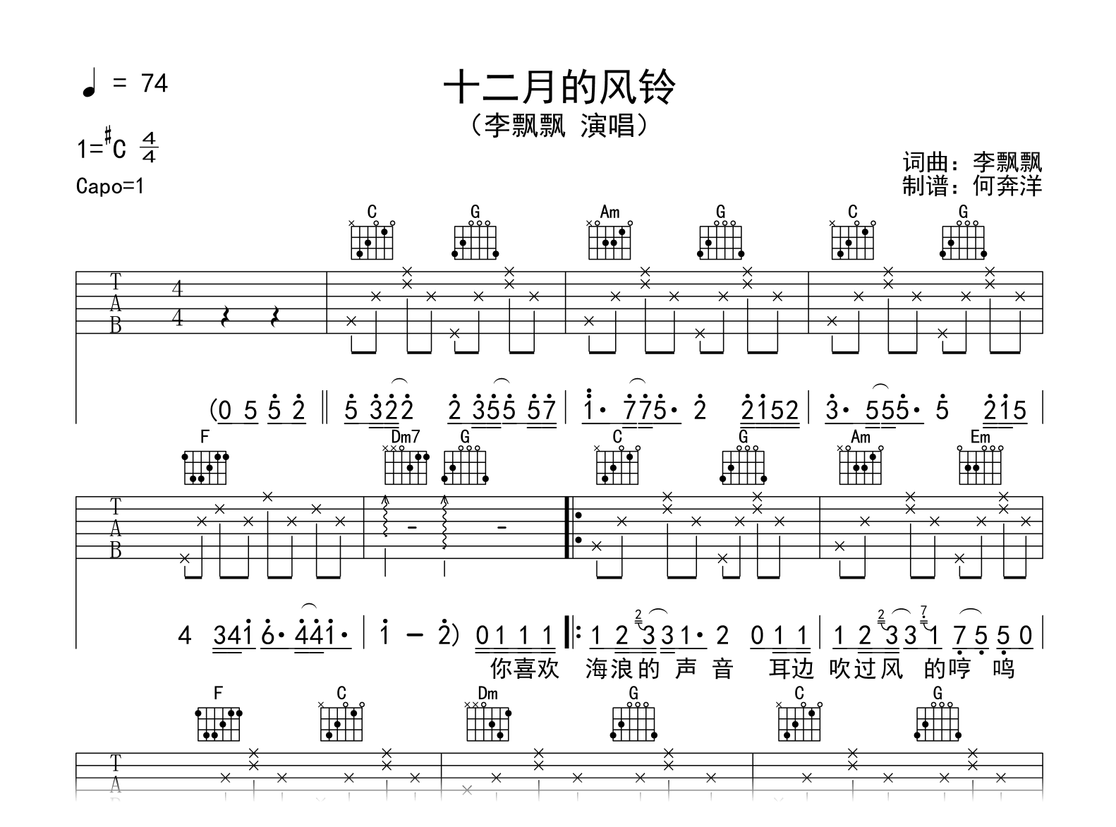 曲谱介绍: 十二月的风铃吉他谱,李飘飘演唱,《十二月的风铃》吉他弹唱谱,原调升C,变调夹夹第一品,选用C调指法编配,高清六线谱共两张图片。