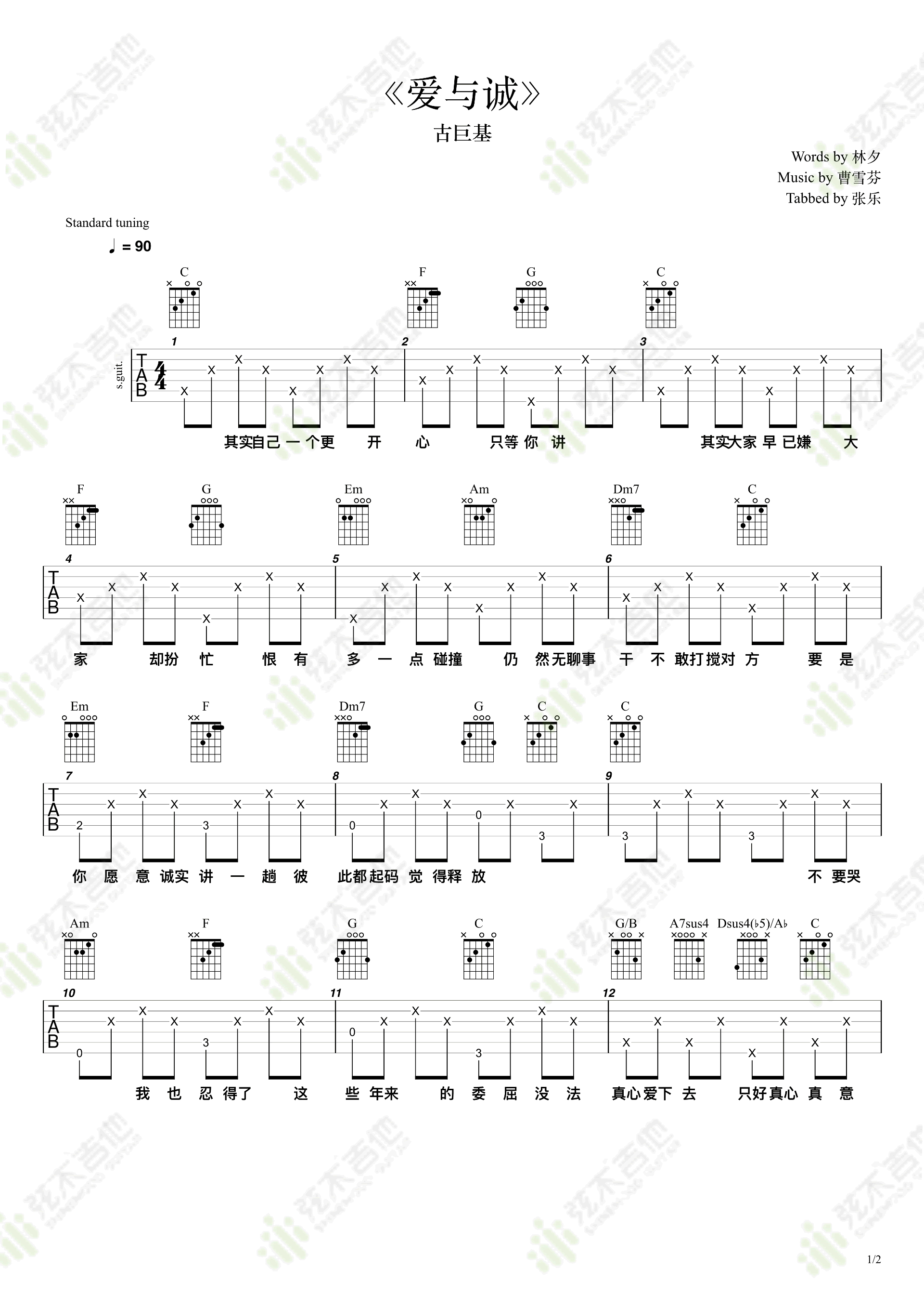 曲谱介绍: 古巨基《爱与诚》吉他弹唱谱,共有2张高清图谱,免翻页排版设计。