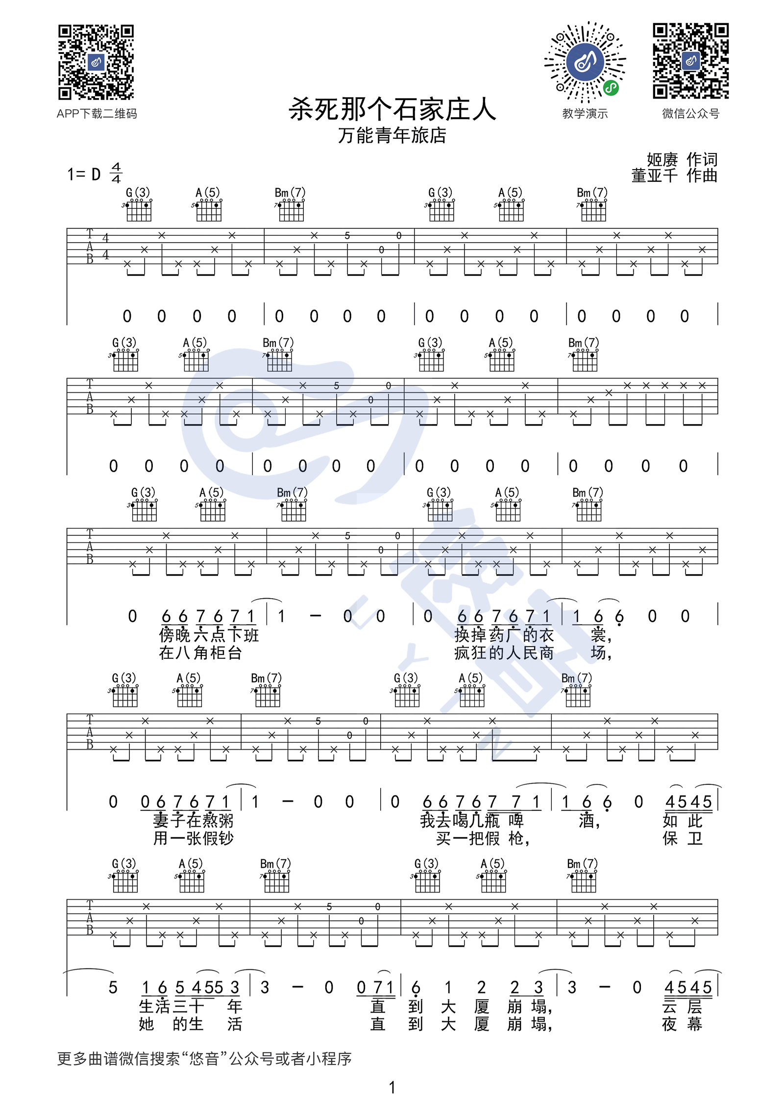 杀死那个石家庄人吉他谱 - 万能青年旅店 - 吉他弹唱谱