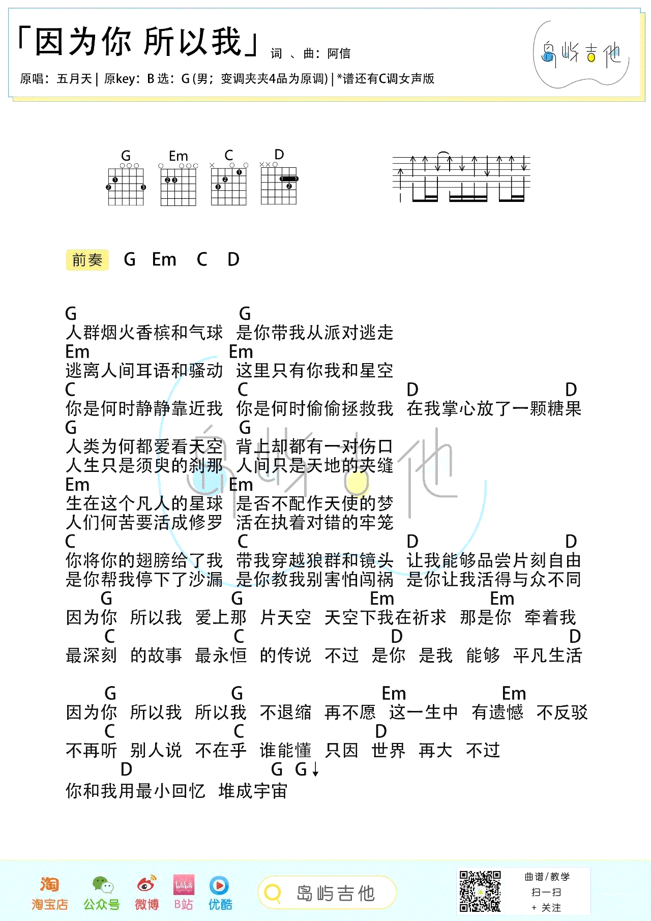 曲谱介绍: 五月天《因为你所以我》吉他弹唱谱,共有3张高清图谱。