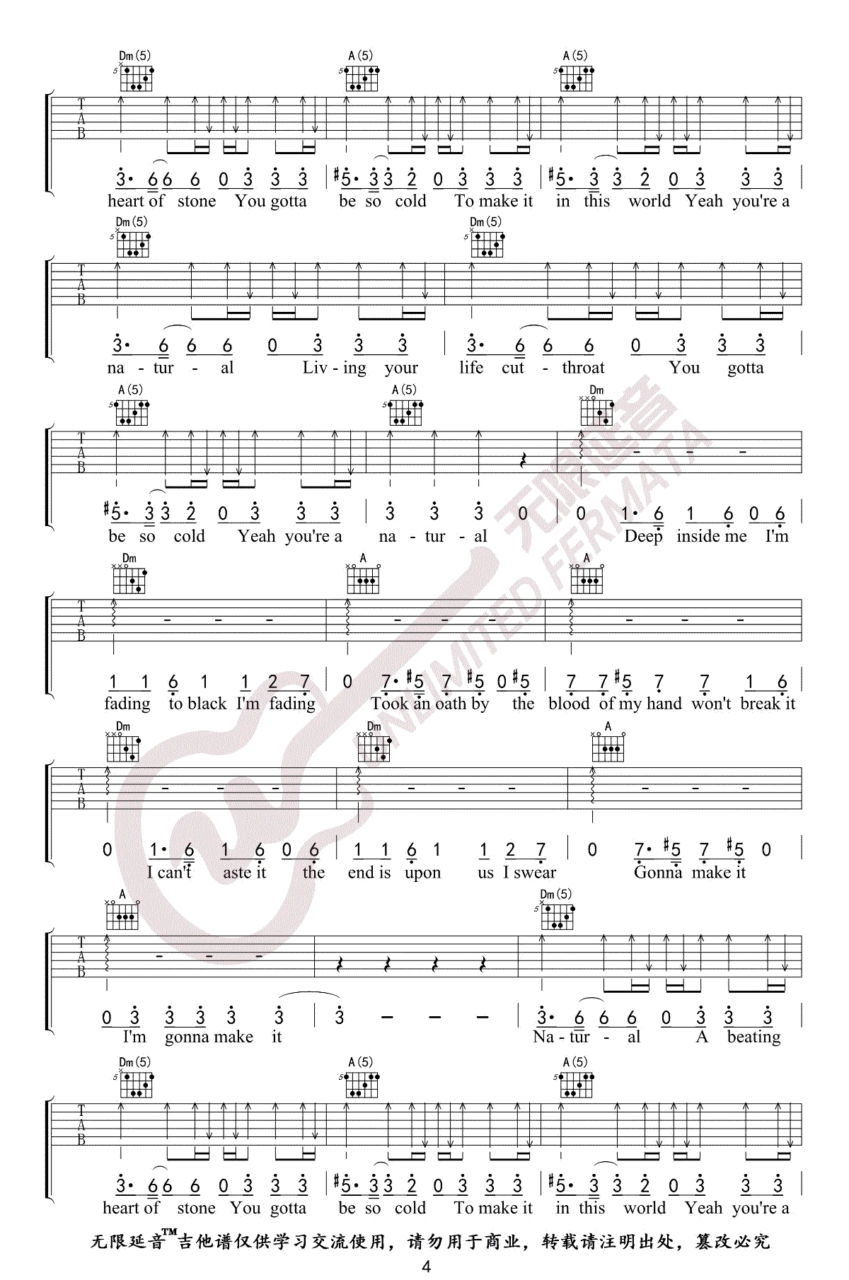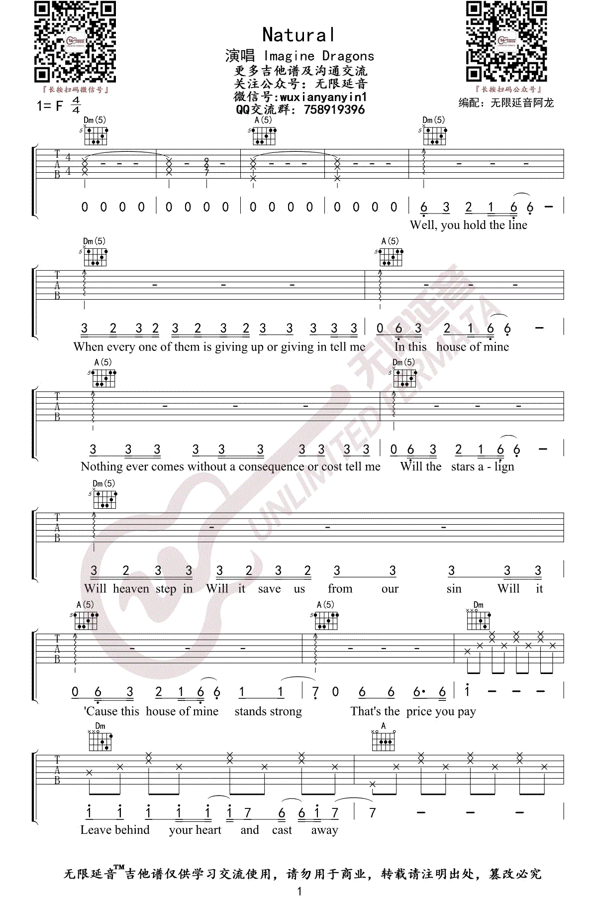 曲谱介绍: Natural,Imagine Dragons梦龙乐队演唱的一首英文歌曲,Natural六线谱,F调指法弹唱,完整版共五张图片谱,无限延音制谱编配,琴谱网网更新上传。 一首非常热血的励志歌曲,节奏、旋律、歌词给人以持续的震撼,传达出永不言弃的精神,也鼓舞了许多挣扎在人生困境中的人,不惧风雨永葆初心。