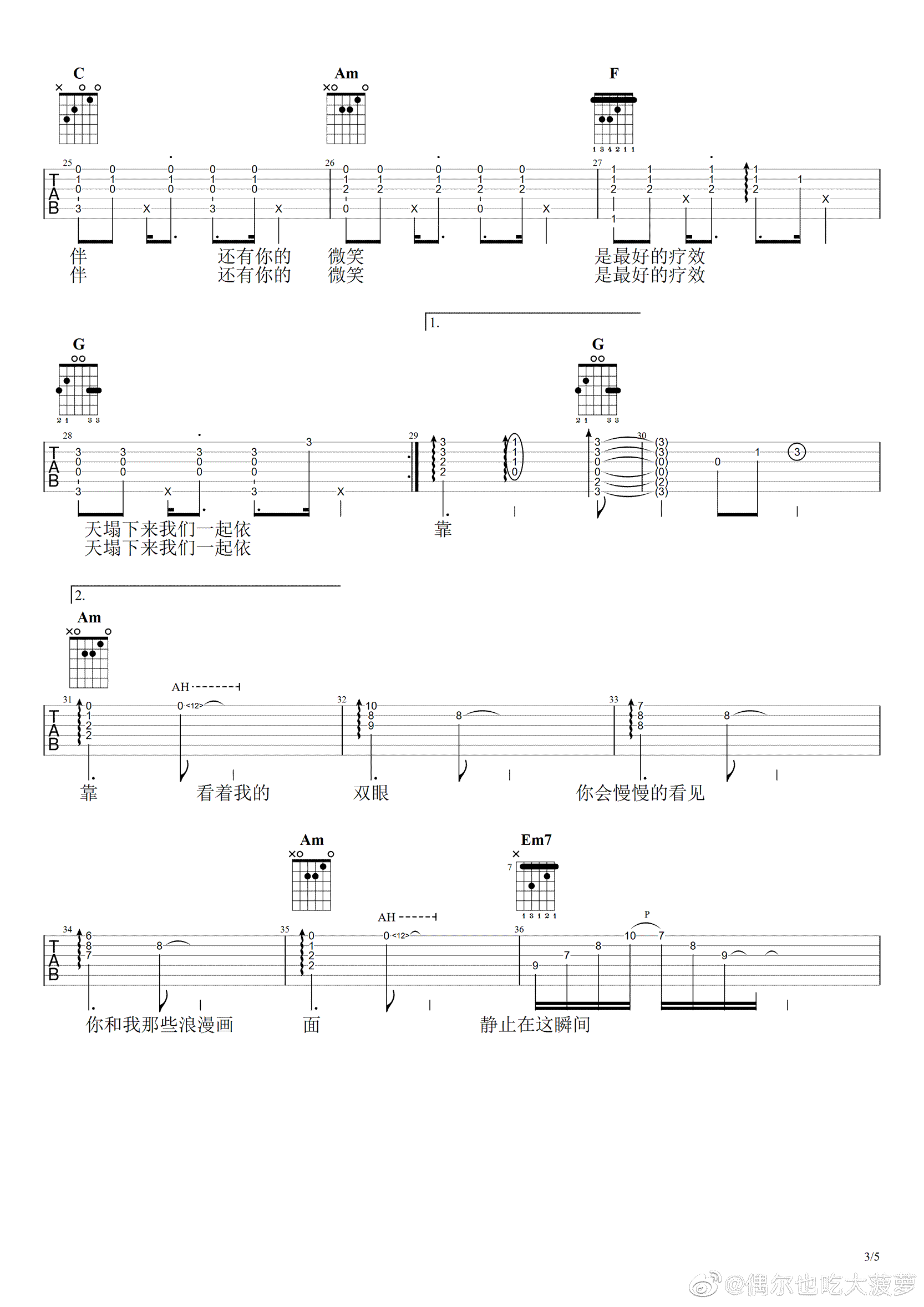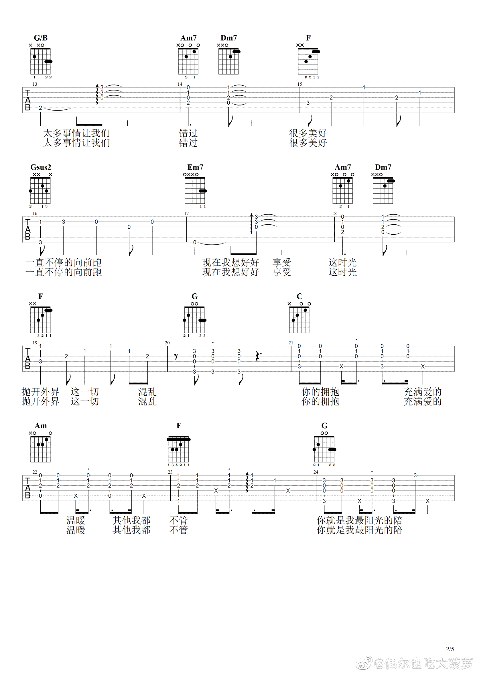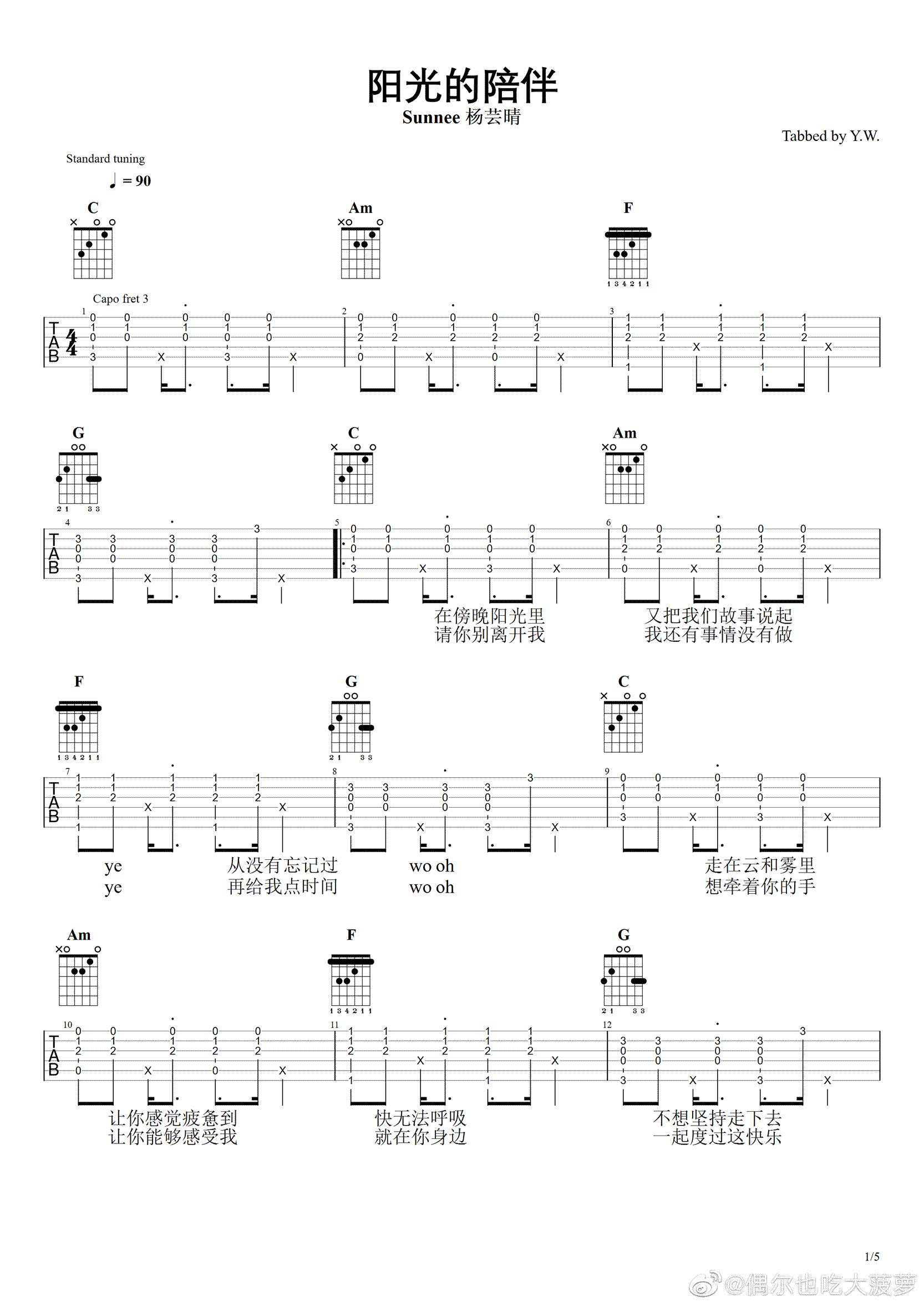 曲谱介绍: 《阳光的陪伴》,杨芸晴演唱,阳光的陪伴六线谱,变调夹夹一品用D调指法或夹三品,用C调指法会轻松很多,完整版共五张图片谱例。偶尔也吃大菠萝编配分享,琴谱网网整理上传。 火箭少女解散的告别典礼刚刚过去,Sunnee杨芸晴签约环球音乐,推出最新单曲《阳光的陪伴》,唱给始终陪在身边的人, 优美的旋律,浪漫的歌词,疗愈内心所有的不安与疲惫,用微笑和拥抱就能抵挡全世界,因为我们要做彼此的太阳。