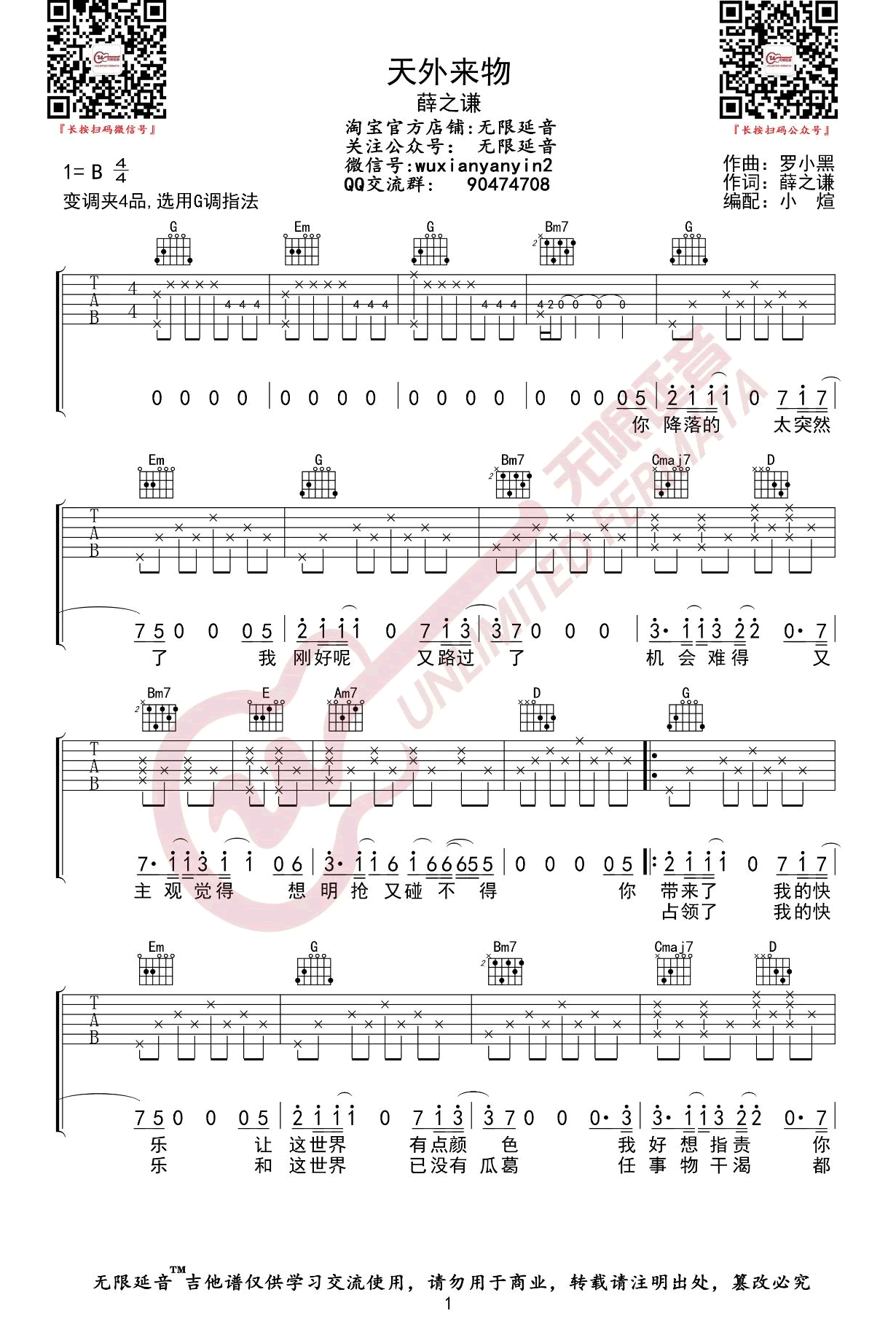 曲谱介绍: 天外来物,薛之谦演唱,原调B,选用G调指法,变调夹夹第四品。天外来物六线谱,三张弹唱图片谱,无限延音编配,琴谱网网分享。 别具一格而又深情款款的嗓音以及感同身受的经历。这首歌演绎了在向自己心爱的人慢慢靠近的那种小心翼翼,还有对他的一往情深。“世界上终有一人能降服你 妖怪”是这首歌曲的灵感来源。